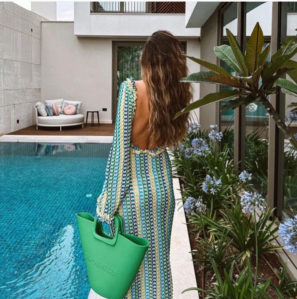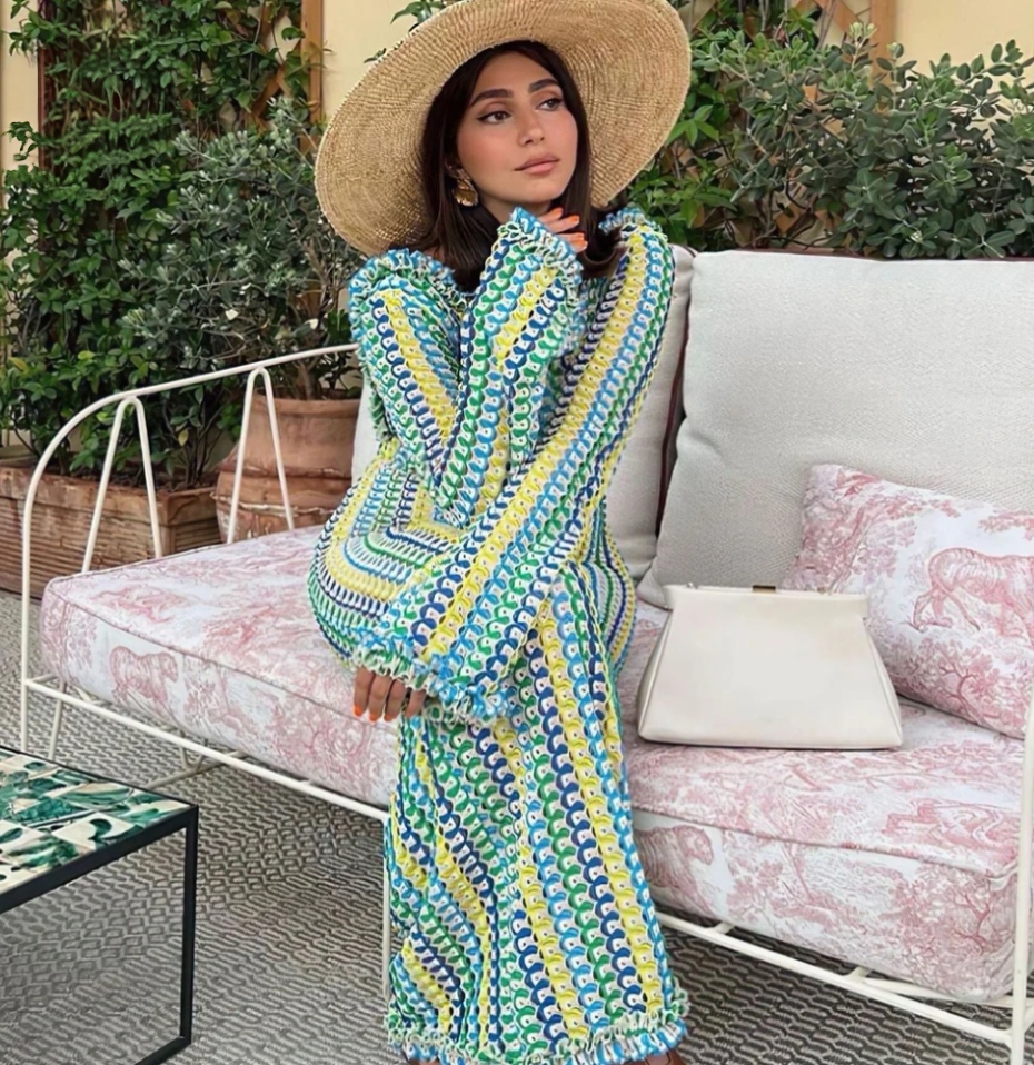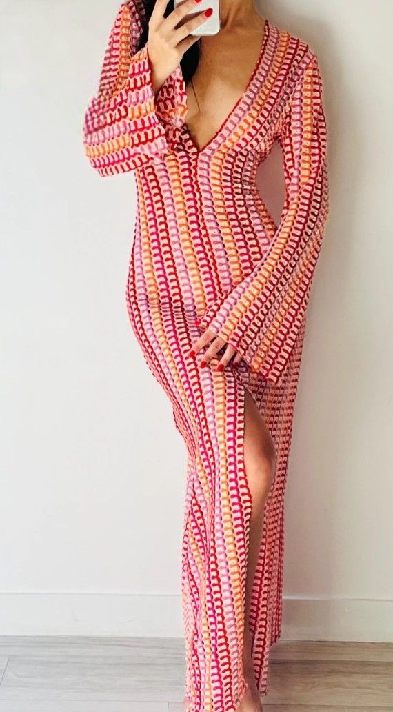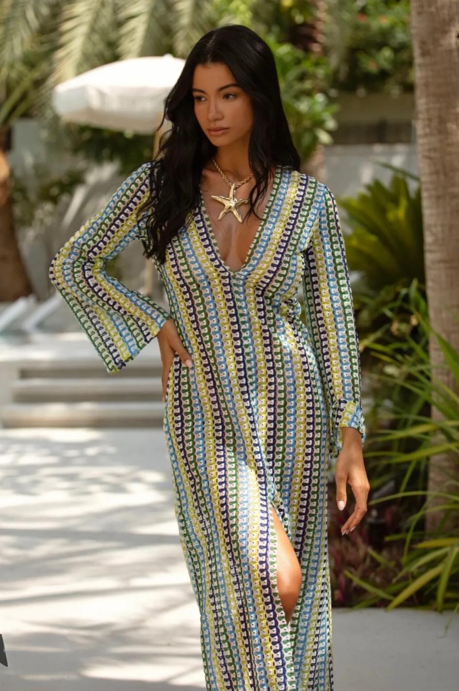Flowy Crochet Knit Maxi Cover-Up Dress with a deep neckline and airy silhouette. Crafted in soft, breathable knit for effortless comfort and elegance. Perfect for beach days, vacations, and resort styling. Lightweight, flattering, and easy to layer over swimwear.