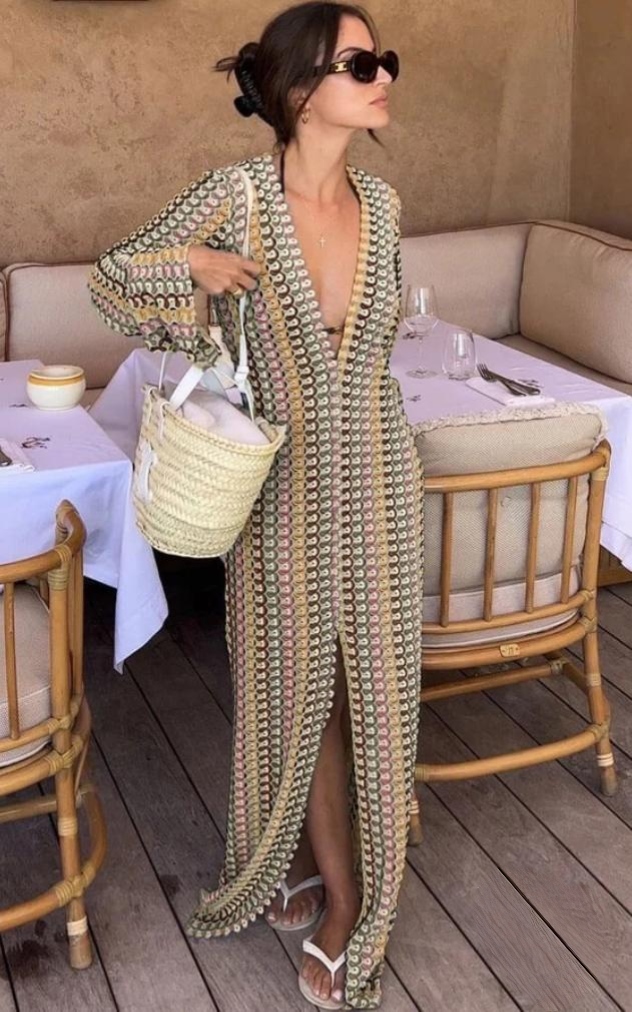 Elegant Crochet Maxi Cover-Up designed with a deep neckline and graceful, flowy fall. Made from soft, breathable knit, it blends comfort with a chic resort feel. Perfect for layering over swimwear or styling for a relaxed vacation look. Lightweight, airy, and effortlessly stylish.