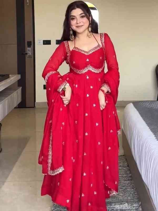 Elevate your ethnic wardrobe with this premium 3-piece Anarkali suit featuring faux georgette fabric, detailed thread & sequin work, and a 4-meter flair. Paired with soft micro cotton pants and a lace-bordered dupatta, it's perfect for festive, wedding, and party wear. Available in sizes S,M,L,XL.