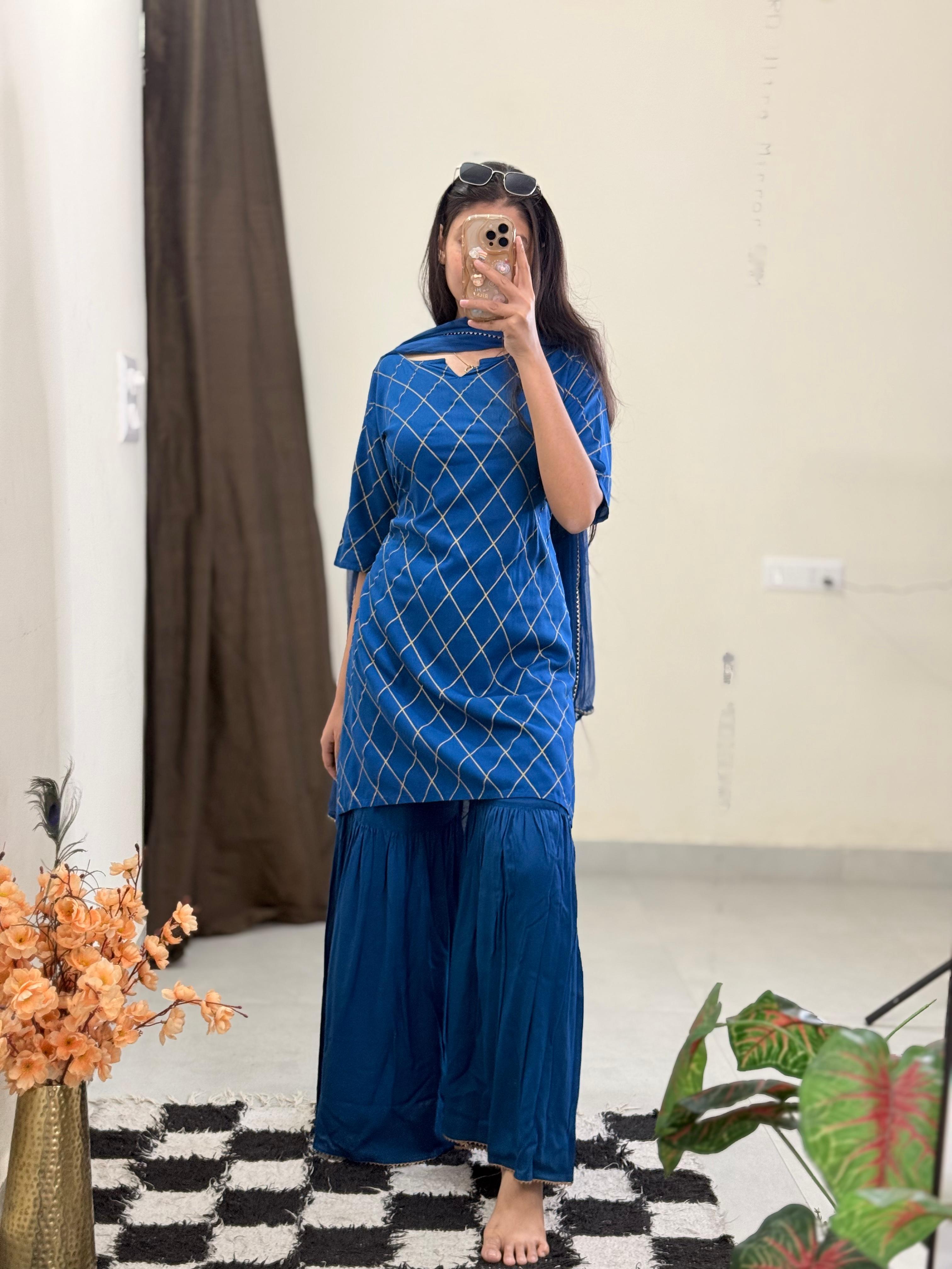 Elevate your ethnic wardrobe with our Geometric Print Blue Sharara Set, featuring a soft cotton-rayon kurti, a matching flared sharara, and a traditional Jorhat dupatta. Perfect for festive occasions, this ensemble combines comfort and style.