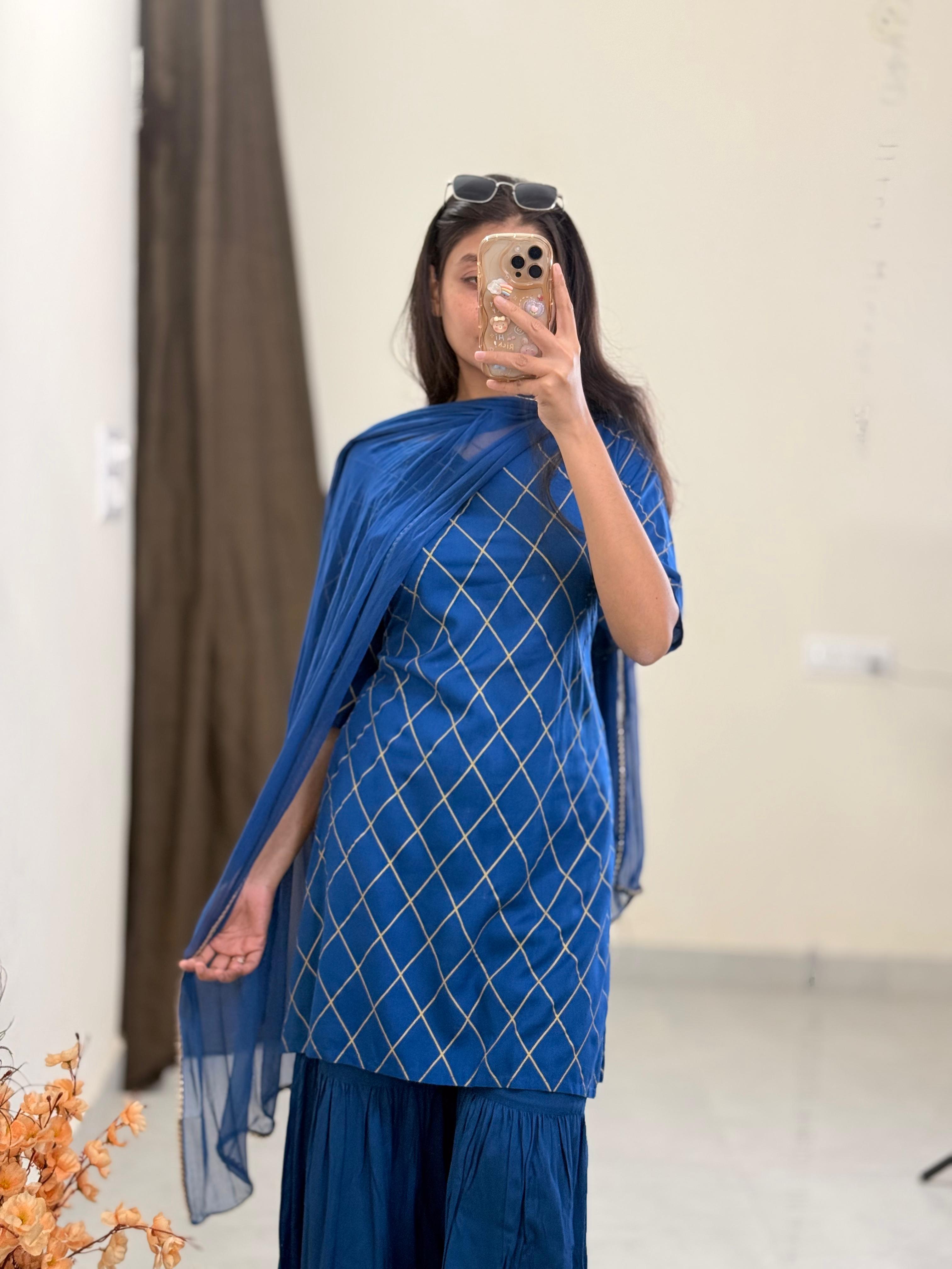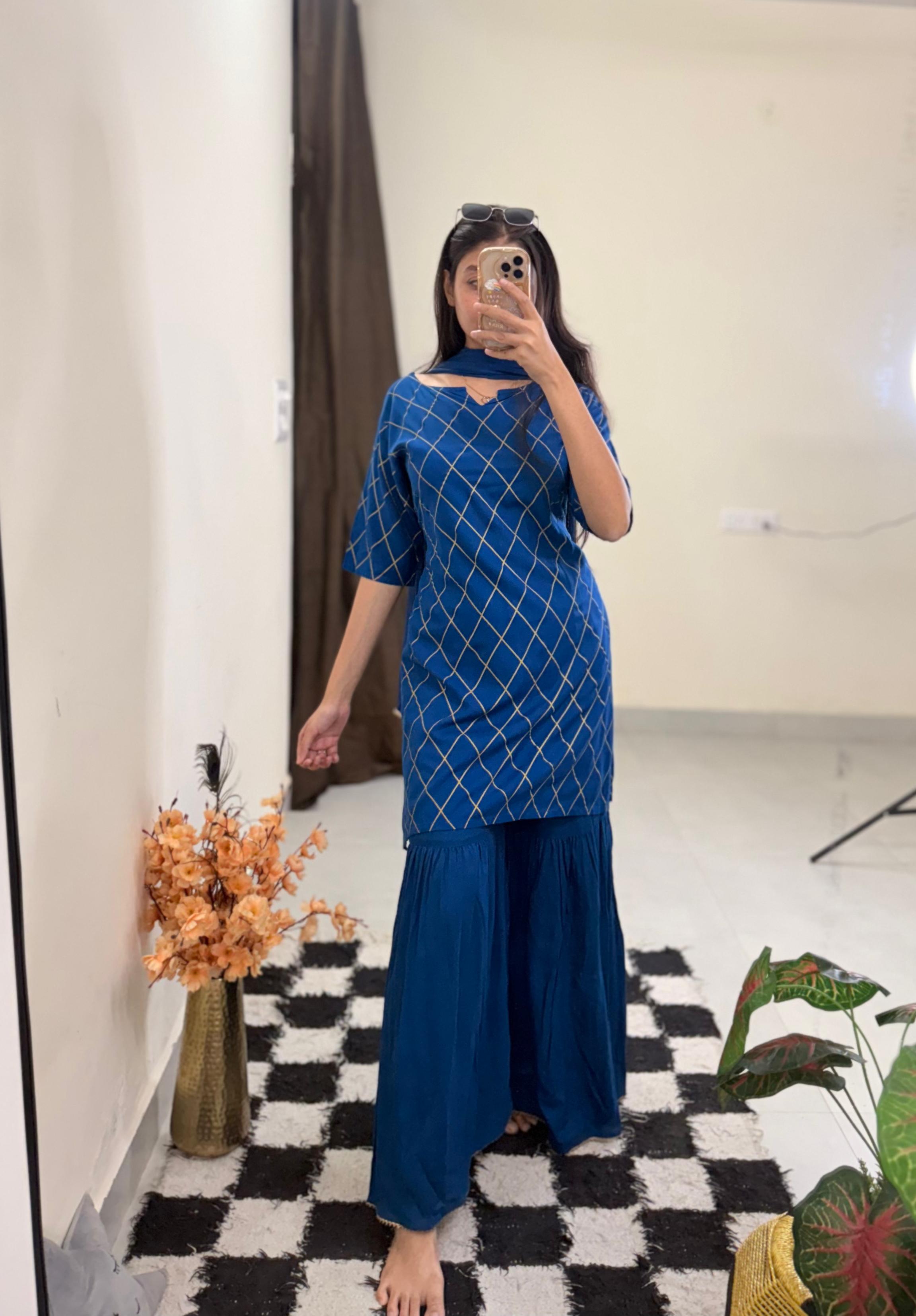 Elevate your ethnic wardrobe with this elegant blue kurti, crafted from soft cotton-rayon fabric. Paired with a matching sharara and a traditional Jorhat dupatta, this set offers a harmonious blend of comfort and style. Available in sizes S, M, L, and XL.