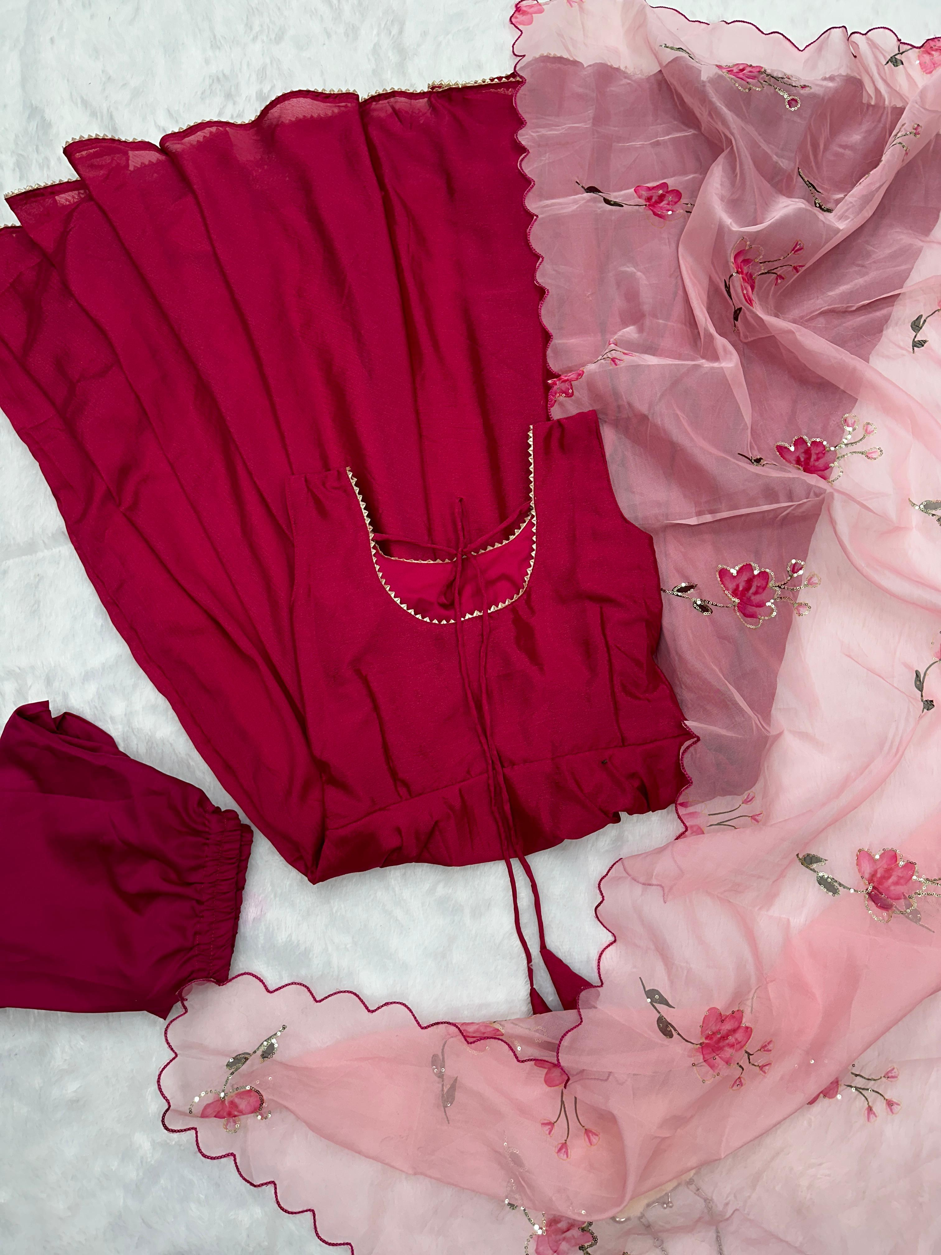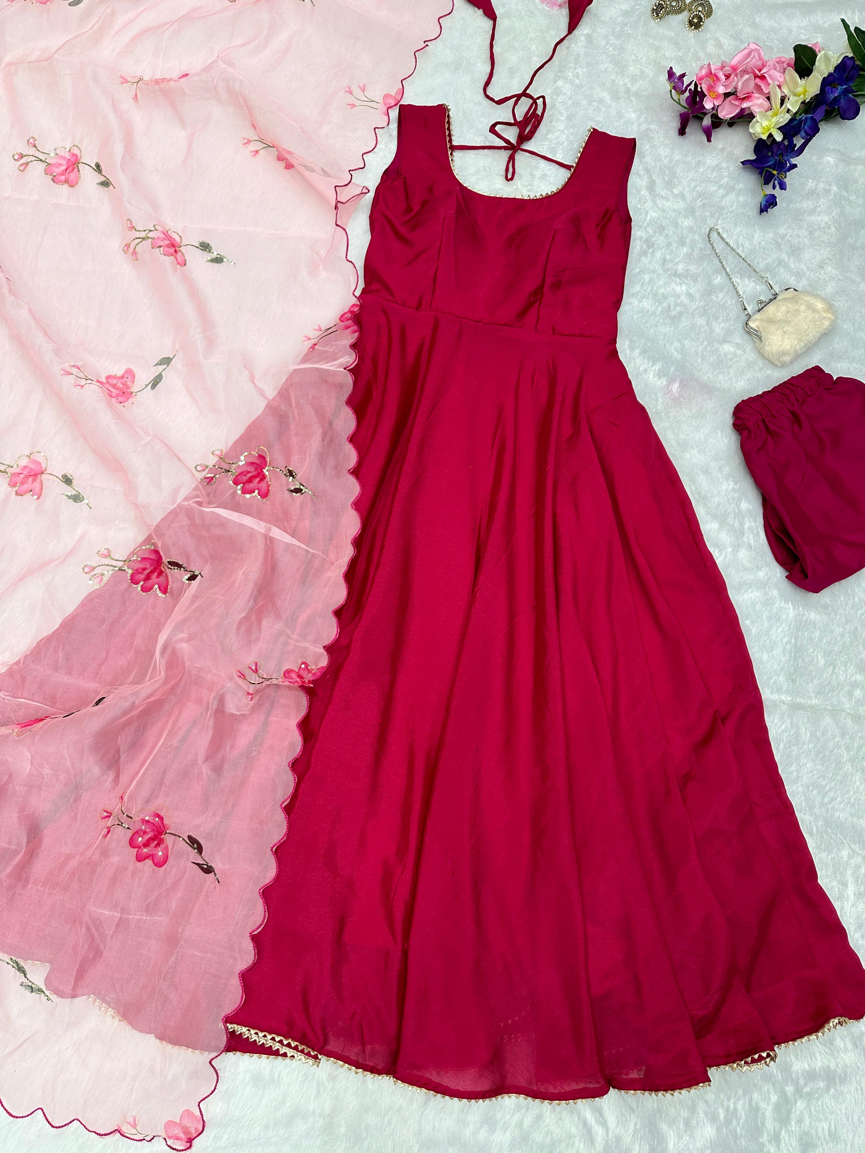 Experience the perfect blend of elegance and modern style with our Pure Chinon Anarkali Suit, designed with a stunning huge flair to elevate your ethnic wardrobe. This fully stitched Anarkali features premium quality Chinon fabric that drapes beautifully and offers comfort throughout the day. Paired with buttery soft buttercotton pants and organza duppata.Perfect for Ideal for festive occasions, weddings, and celebrations.Available in Size-S, M L and XL.