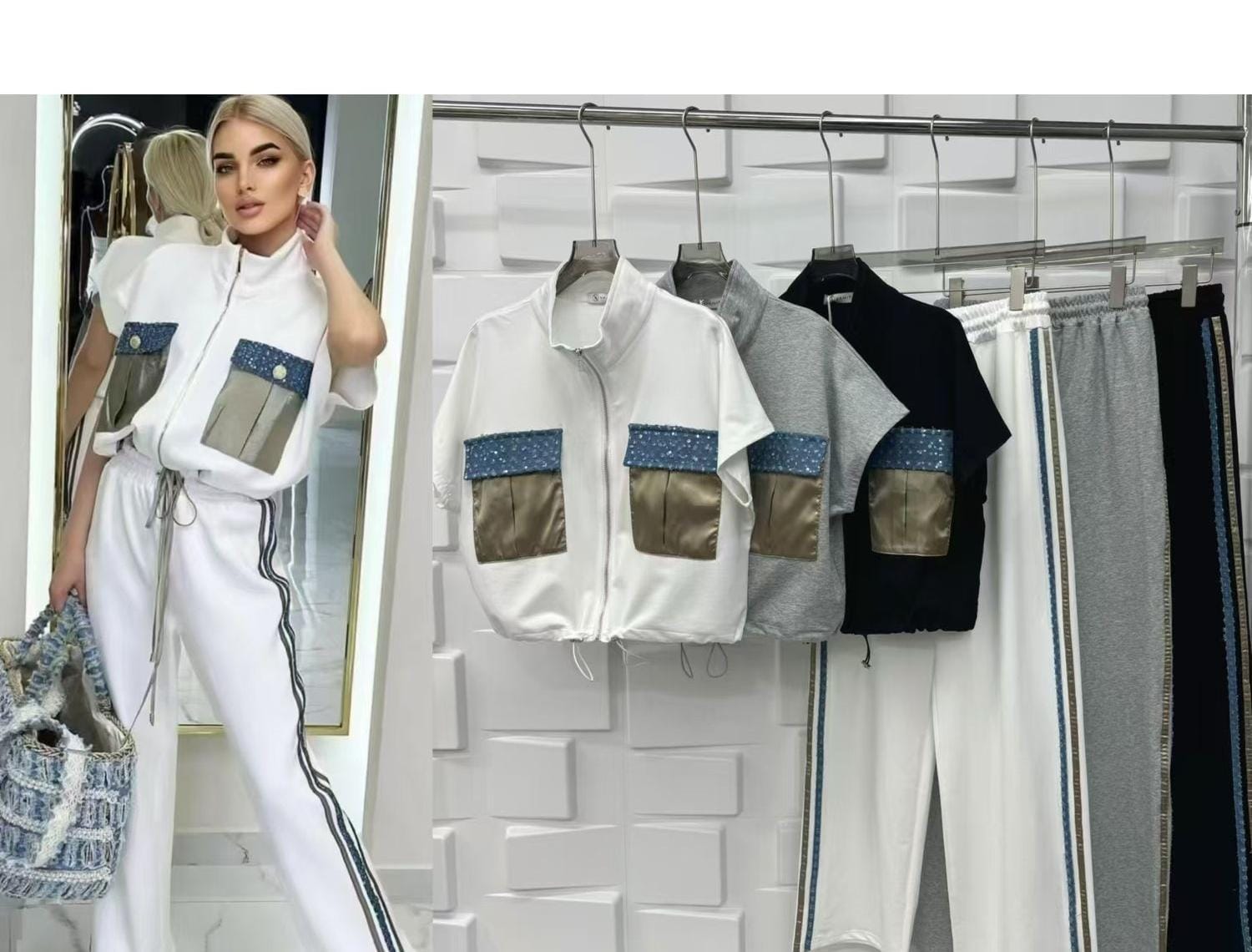 Turn heads in this stylish coord set featuring eye-catching sequin pocket details. Available in Size-SM,L,XL . Perfect for brunch, casual outings, or glam evenings.