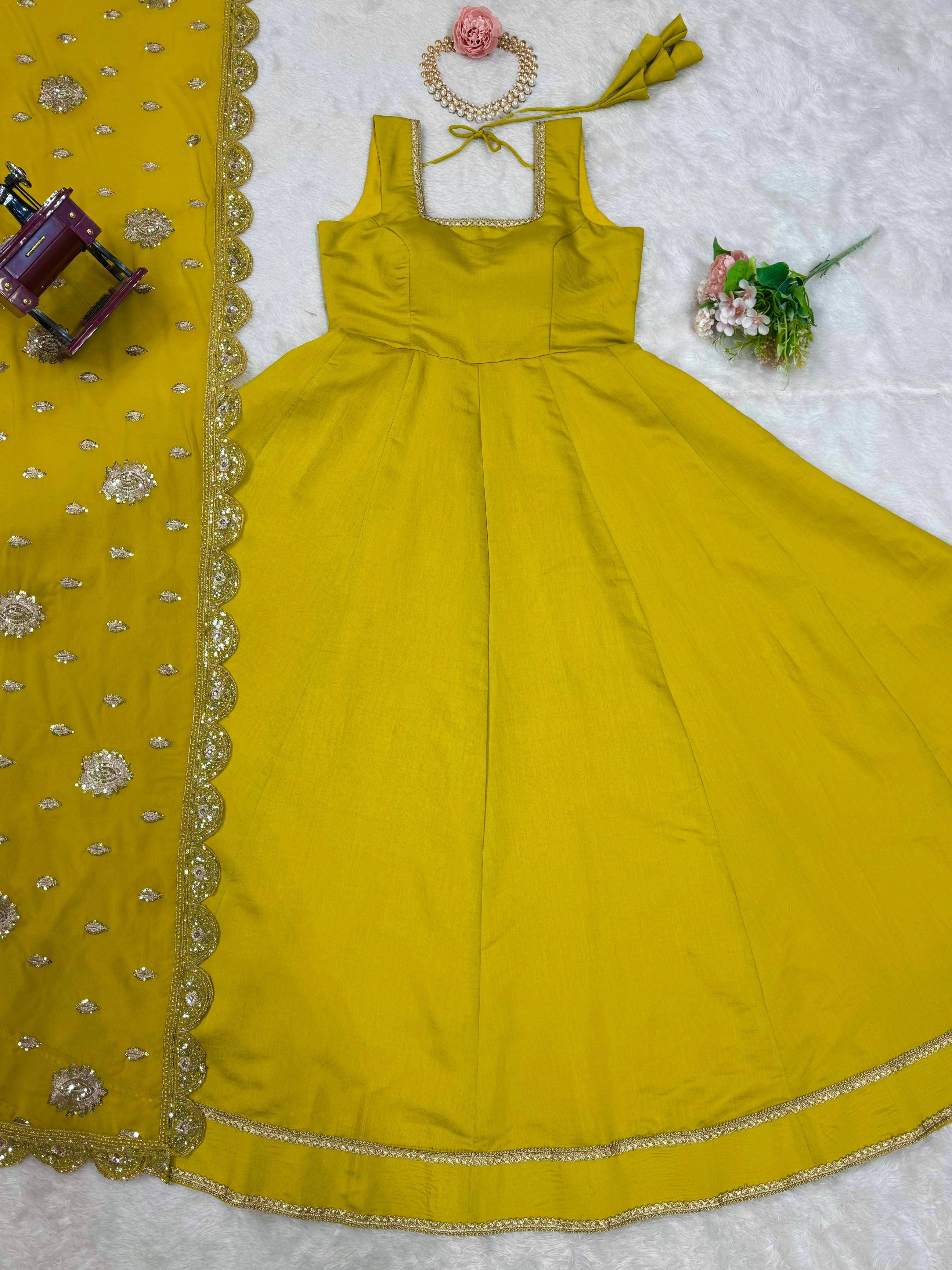 Elegant designer gown in heavy Roman silk with fancy lace work, paired with a matching faux georgette dupatta featuring thread and sequin embroidery. Available in sizes -S,M , L, XL and XXL. Perfect for weddings and festive occasions.