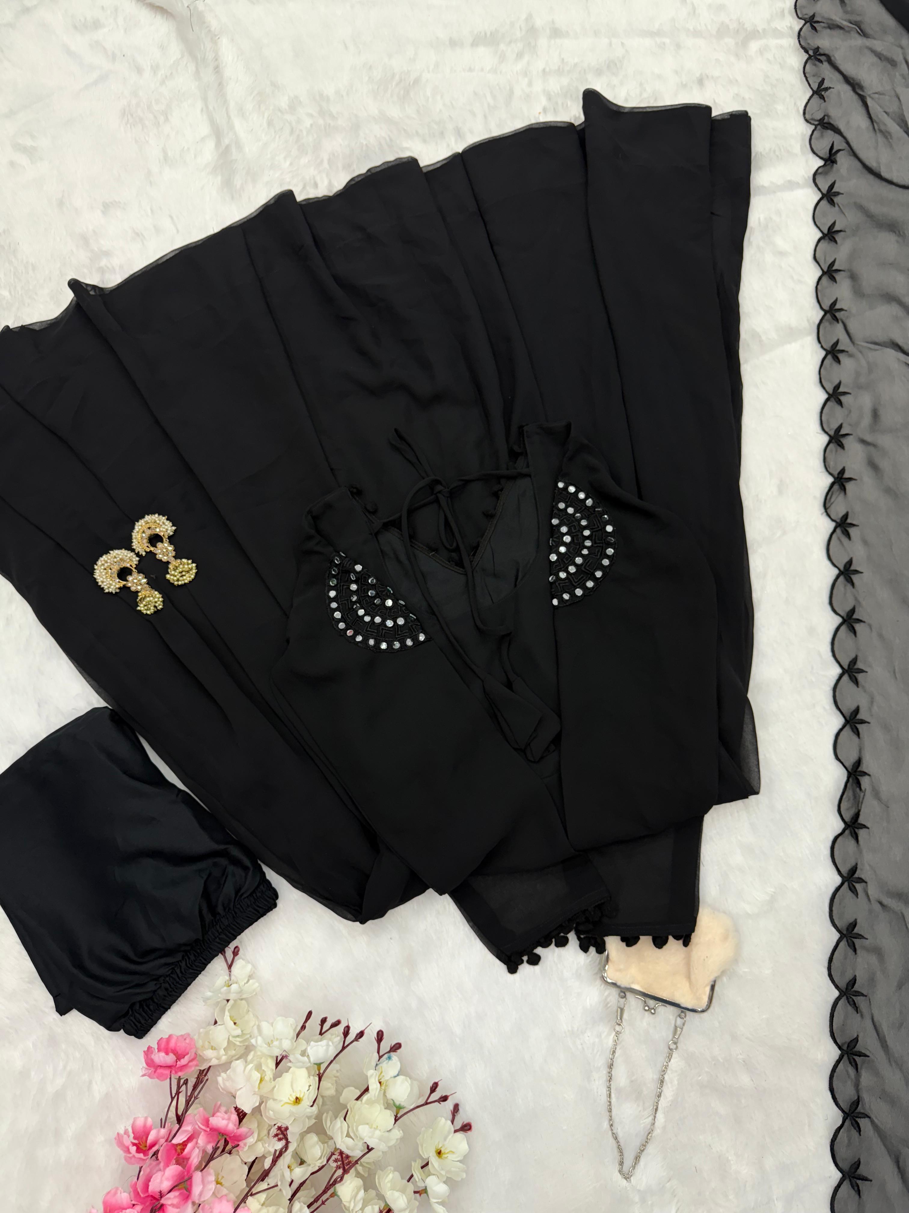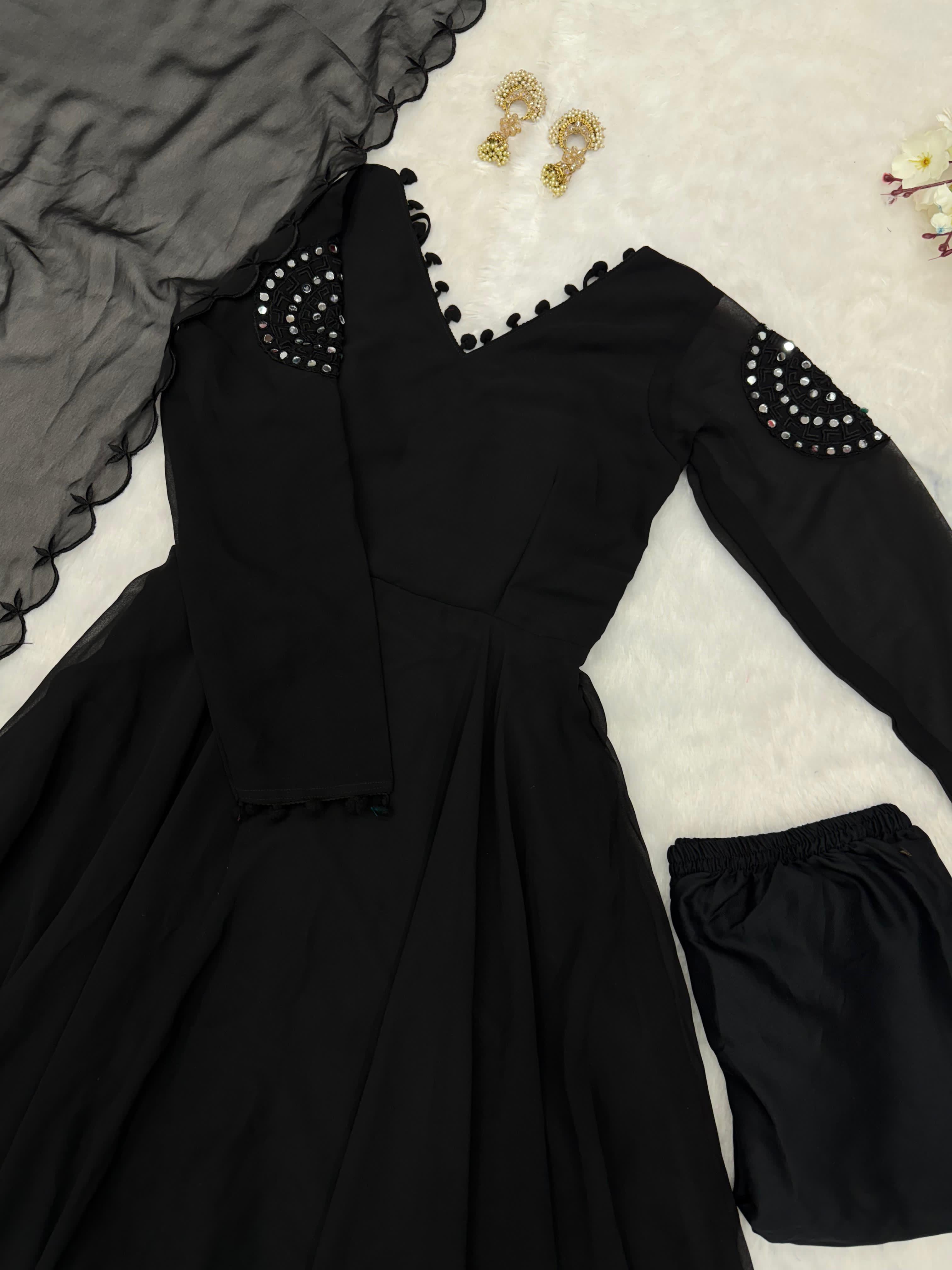 Shop this elegant Georgette Anarkali suit featuring exquisite Hotfix work and a flowing flair. Comes with comfortable Buttersilk pants and a beautiful 2-meter Georgette dupatta with authentic mirror lace border. Fully stitched and available in Size-S , M, L and XL— perfect for festive occasions and weddings.