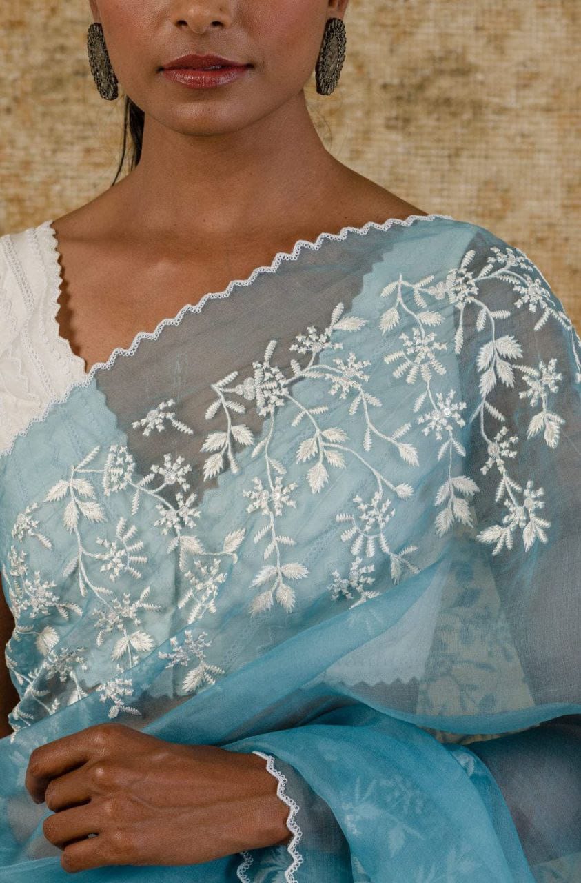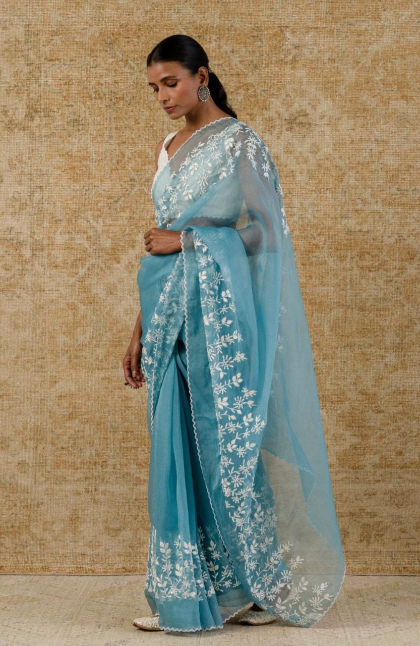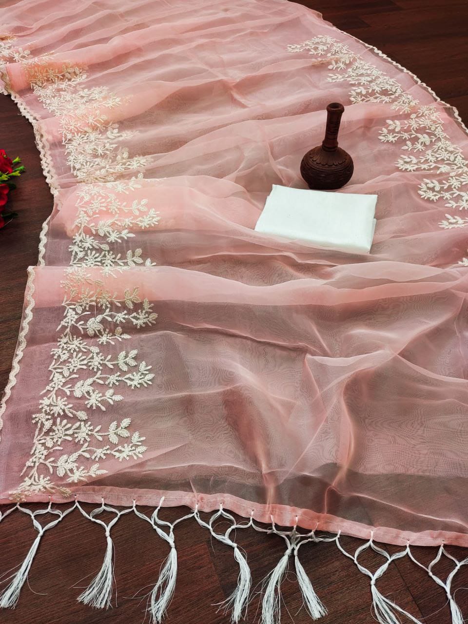 Graceful Organza Silk Saree with heavy embroidery and unique zalar pallu detailing. Paired with a stylish Banglori satin blouse — perfect for festive and special occasions.Available in Size-S, M, L and XL.