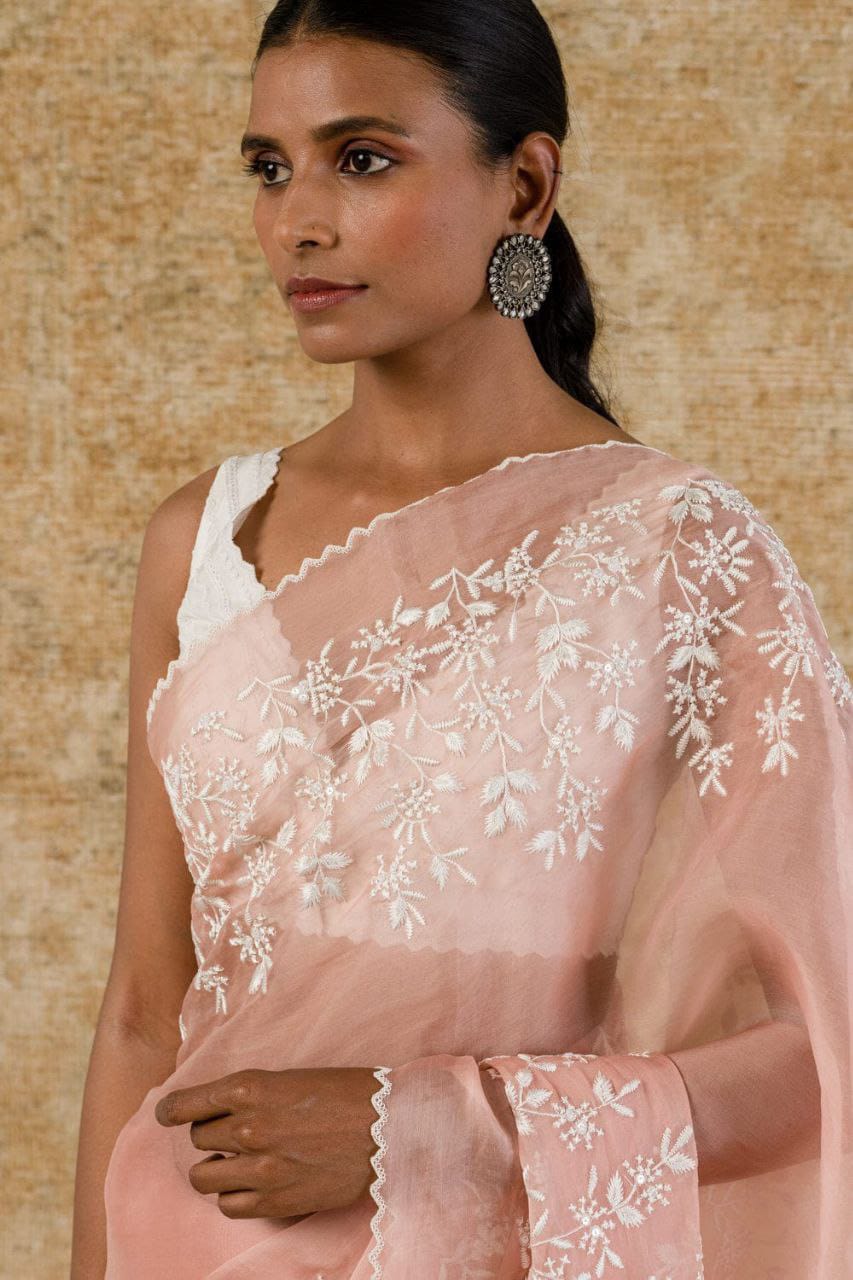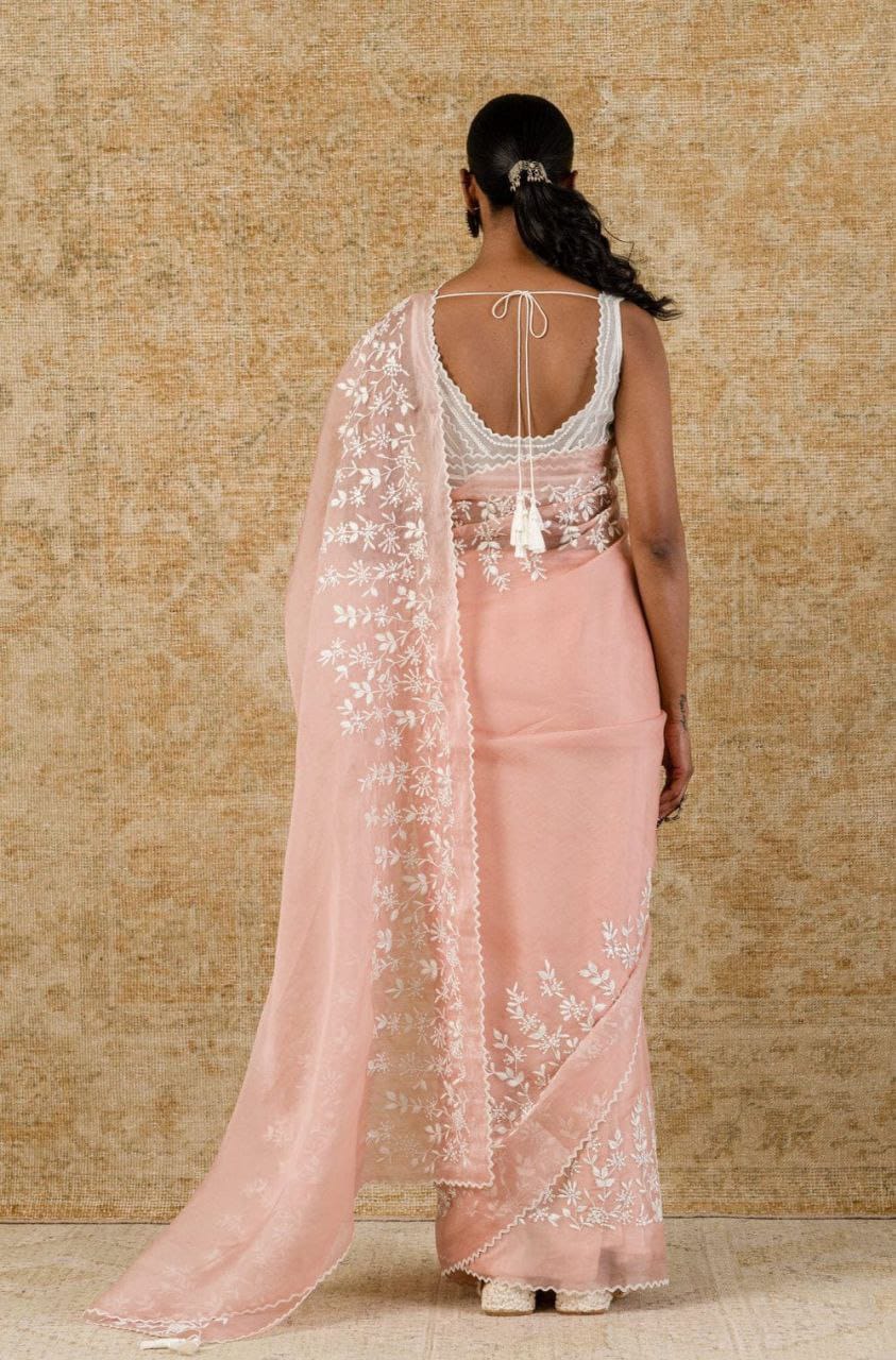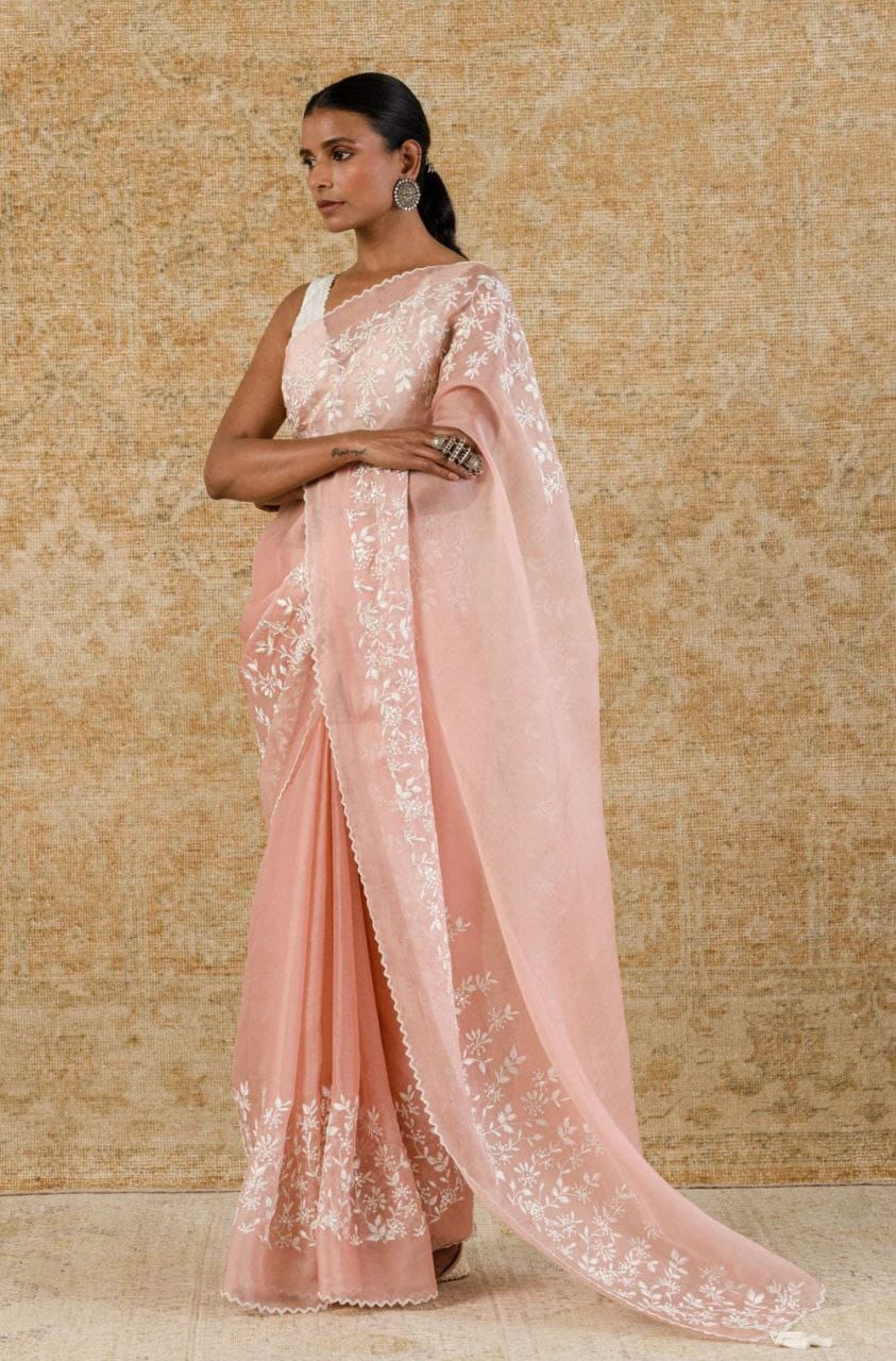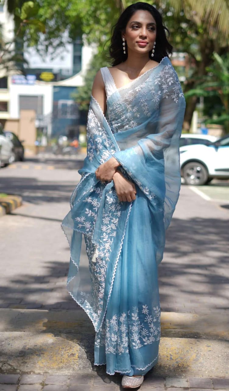 Graceful Organza Silk Saree with heavy embroidery and unique zalar pallu detailing. Paired with a stylish Banglori satin blouse — perfect for festive and special occasions.Available in Size-S, M, L and XL.