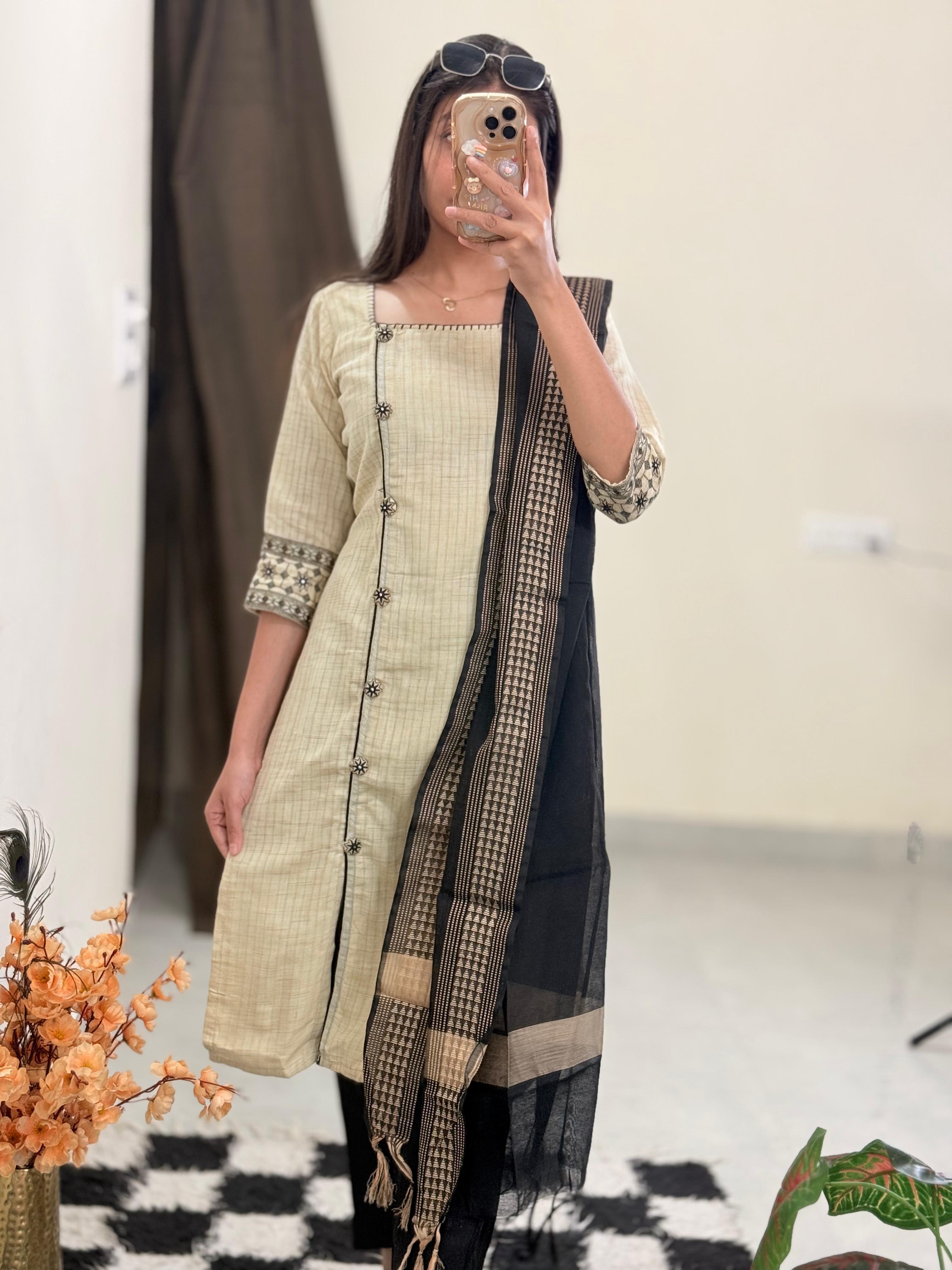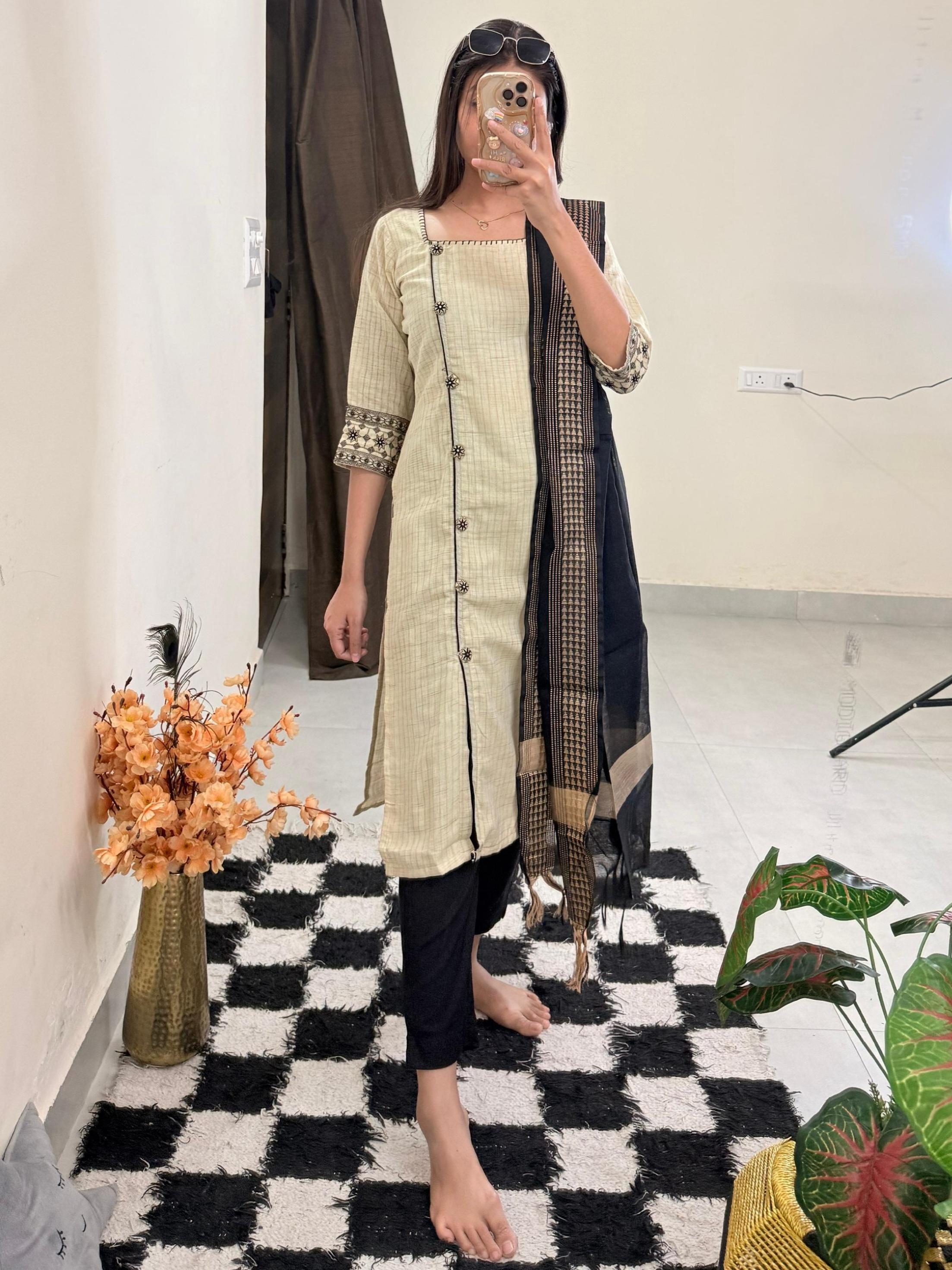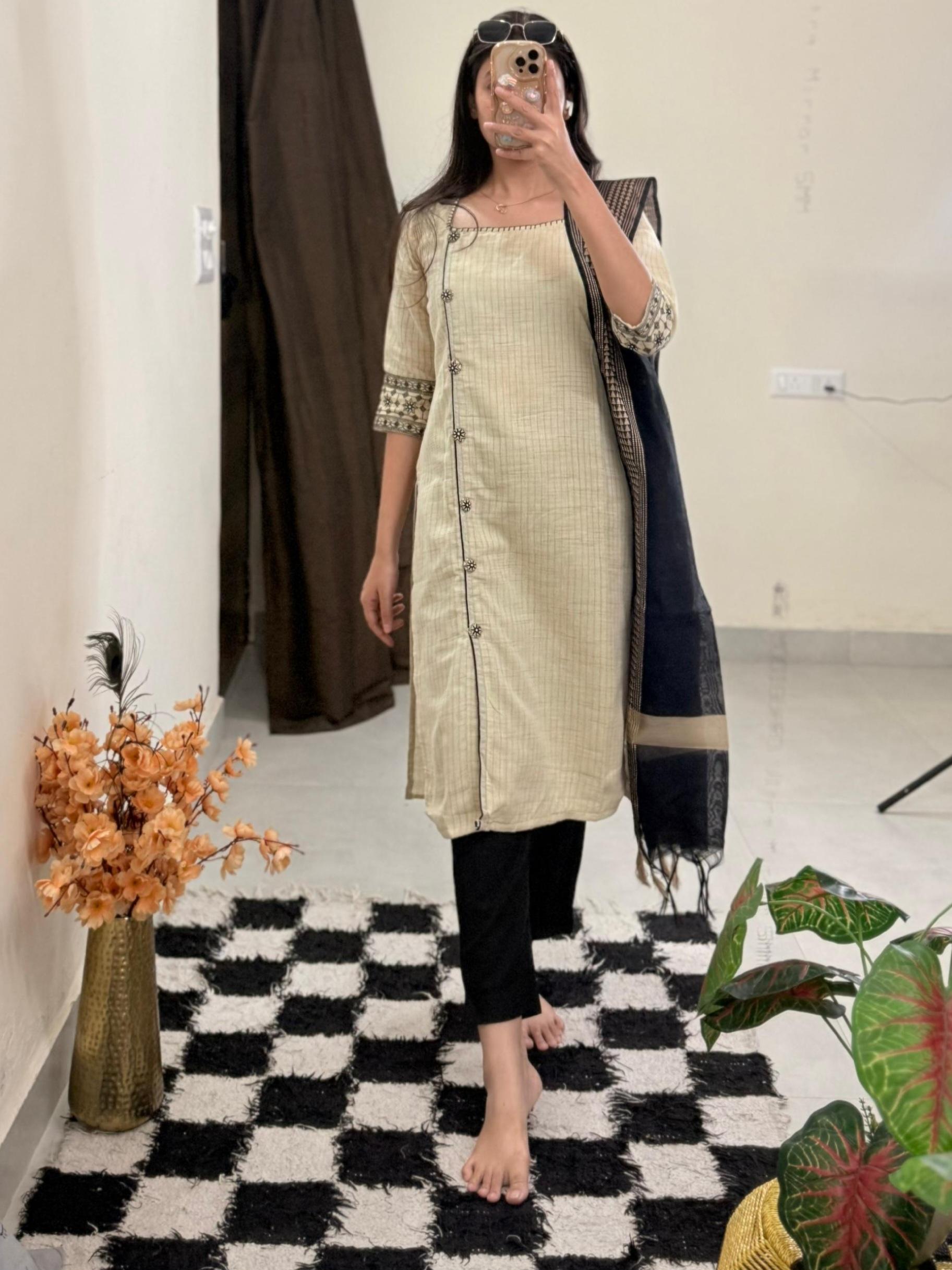Crafted from soft cotton, this 3-piece suit set includes a kurta with full running stitch, paired with sleek black pants and a coordinating plain dupatta. Ideal for daily wear or casual outings, it offers comfort and style in one ensemble.