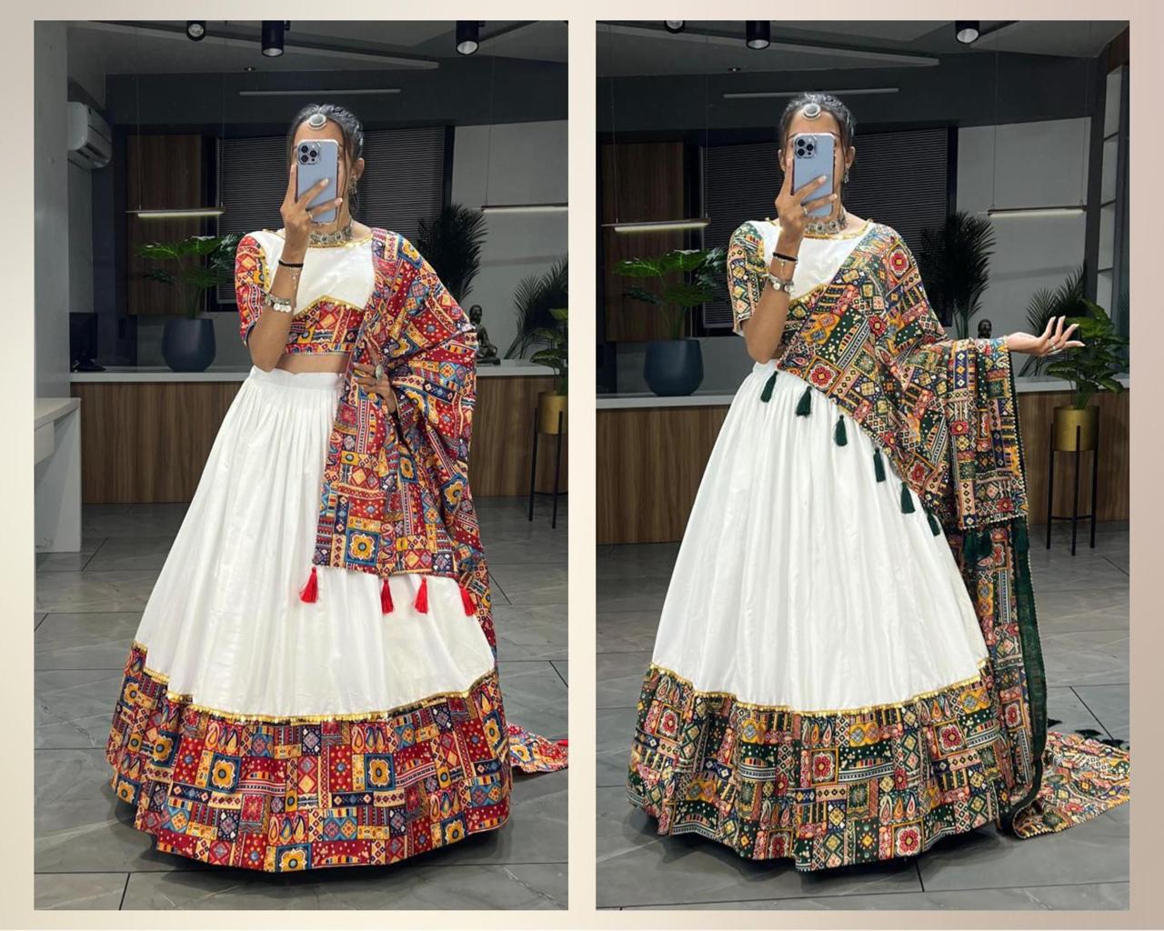 Shop this Elegant Stitched Chaniya Choli Lehenga Set crafted from pure rayon cotton fabric. Featuring a stylish foil print patchwork border lehenga with a drawstring waist (fits Size-S, M, L, XL), a fully stitched cotton patchwork blouse with fancy back design, and a lightweight foil-printed rayon cotton dupatta (2.35m). Perfect for festive occasions and traditional events.
