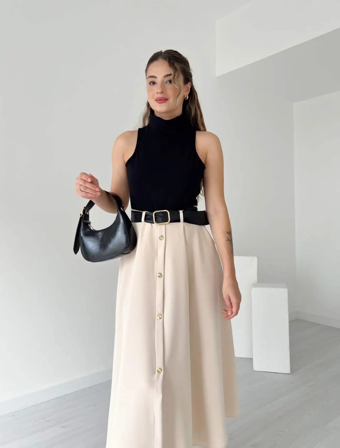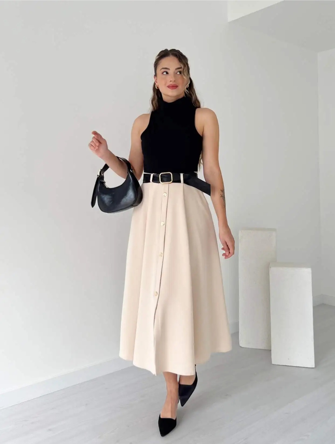 Upgrade your wardrobe with this elegant two-tone attached dress featuring a sleek and a button-down midi skirt. The design is completed with a statement belt, making it perfect for office wear, casual outings, or smart brunch looks. Made for comfort and effortless style.