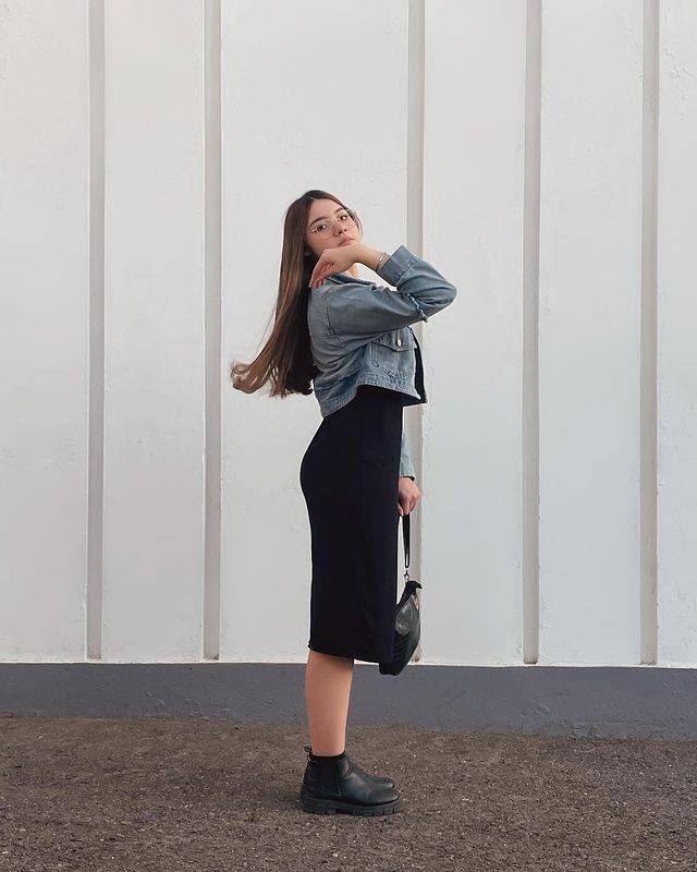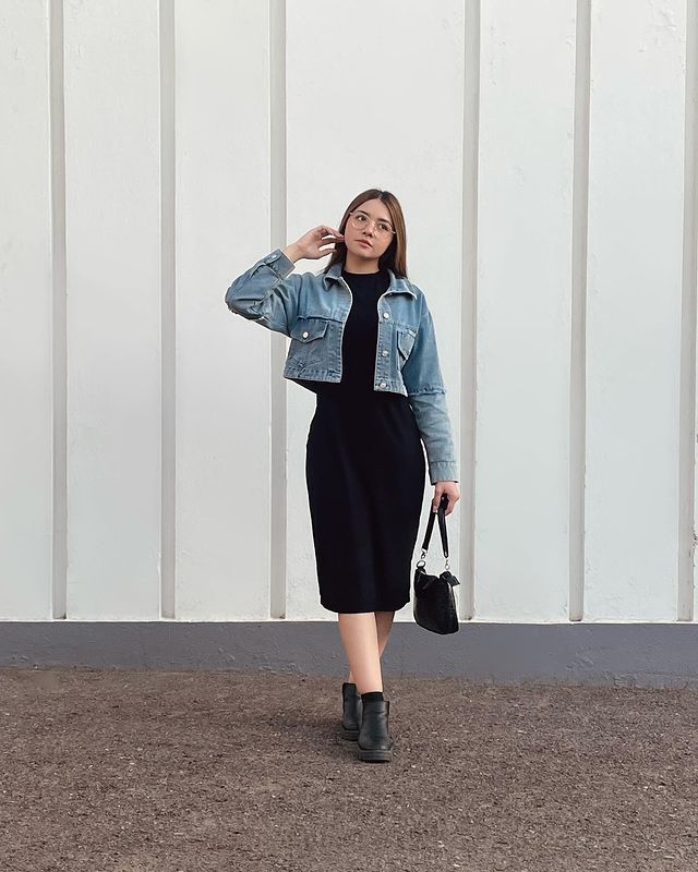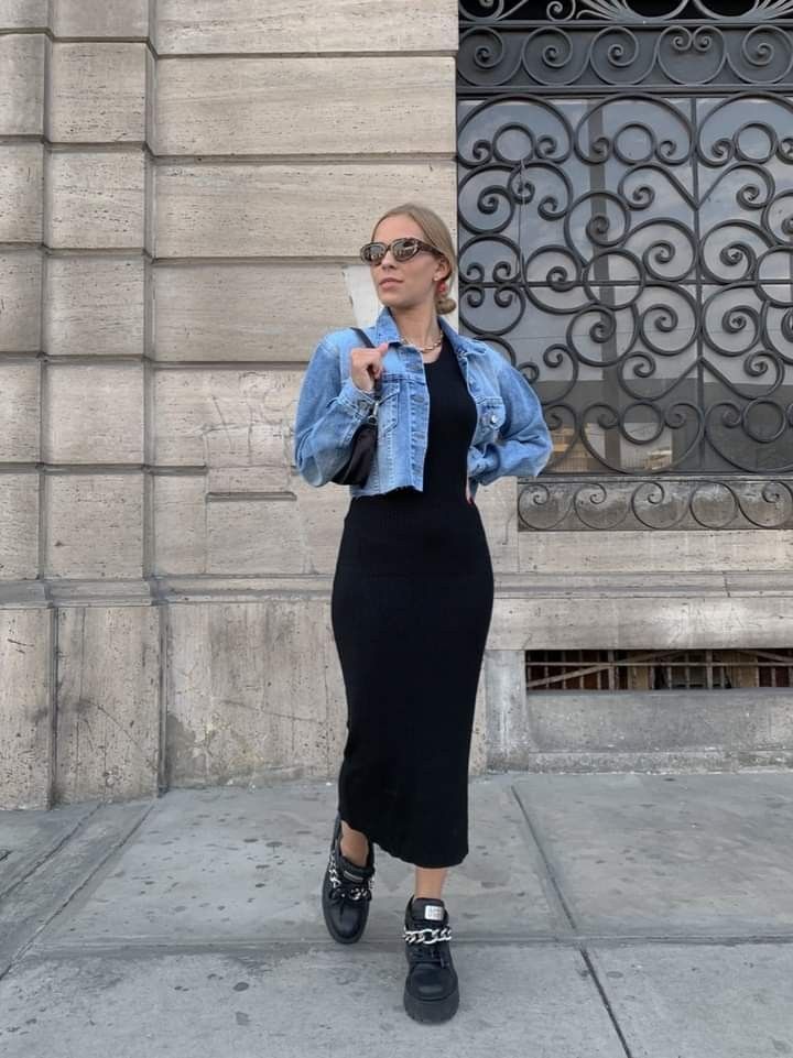Product Name: Navy Blue Denim Jacket & Black Ribbed Dress Set