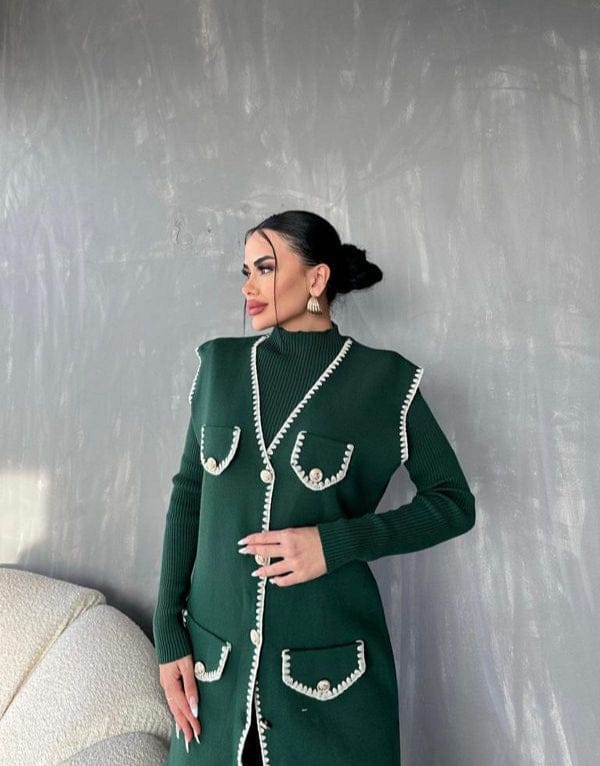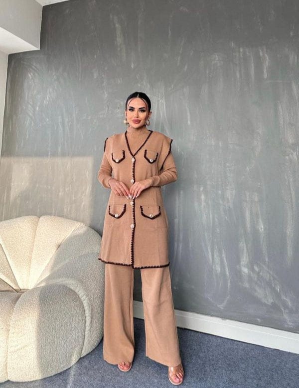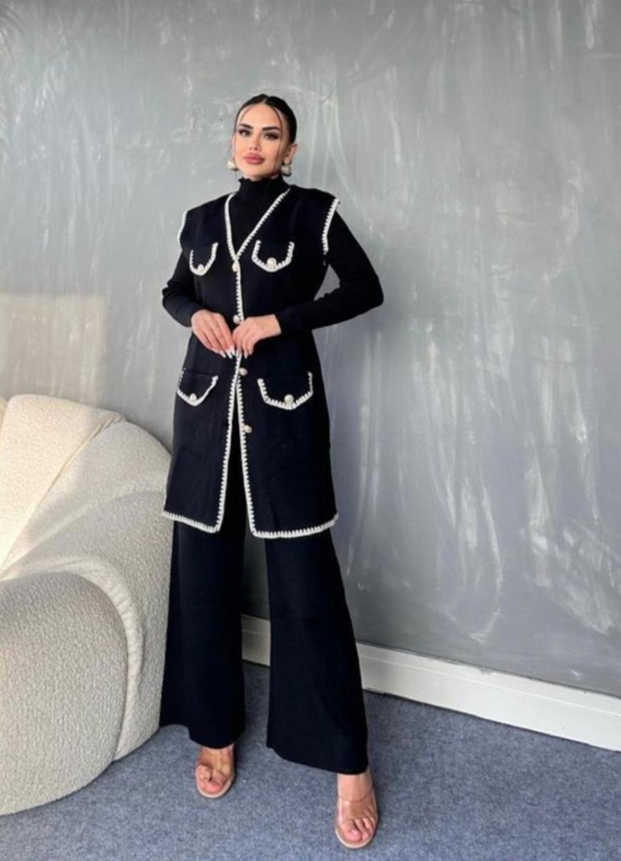Step into effortless elegance with this black pearl-trimmed co-ord set, featuring a long sleeveless vest paired with flowy wide-leg trousers. Designed for comfort and sophistication, this look is perfect for parties, dinners, or evening outings — a timeless statement in every wardrobe.