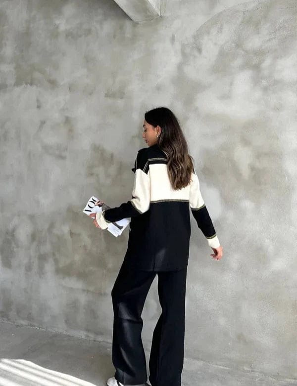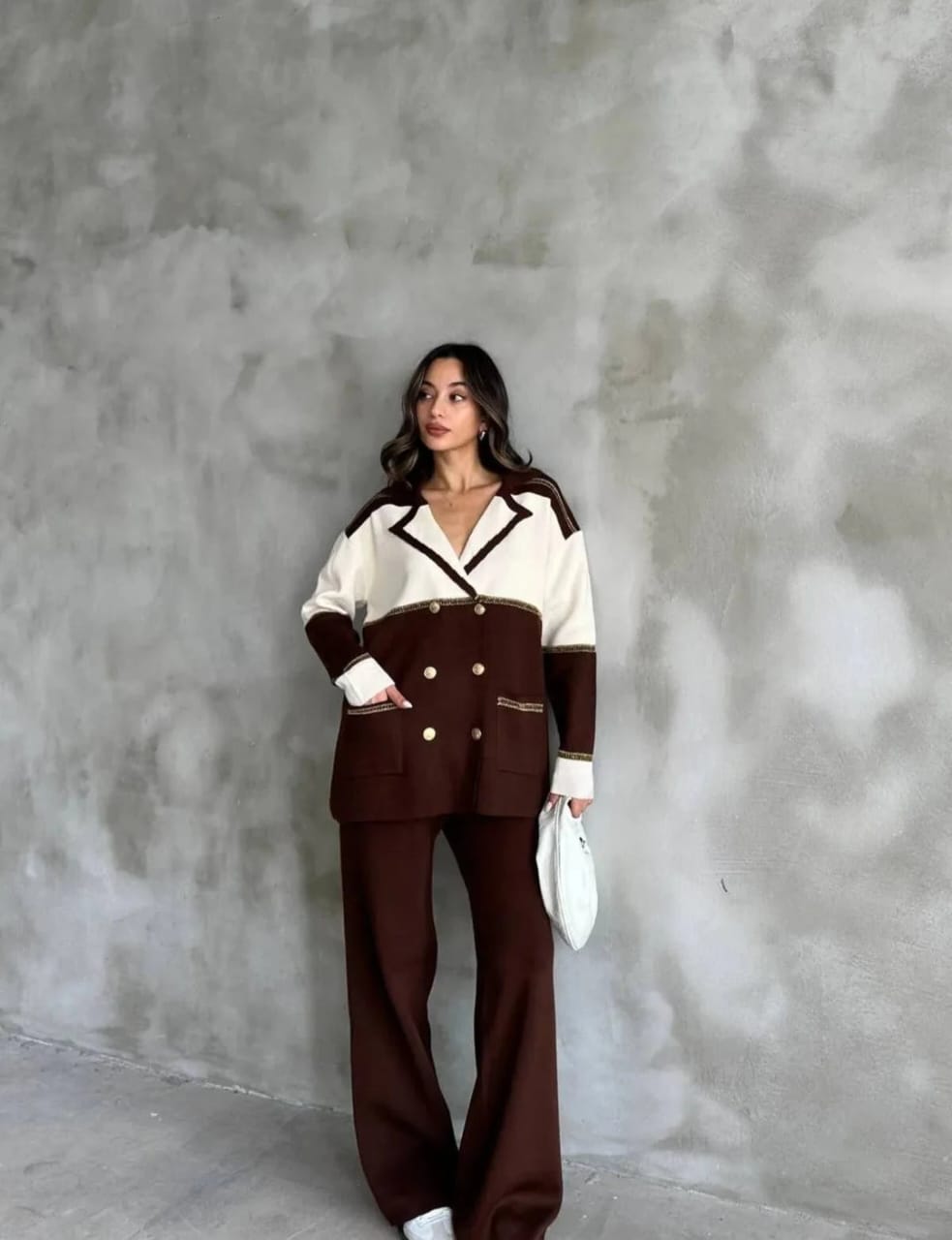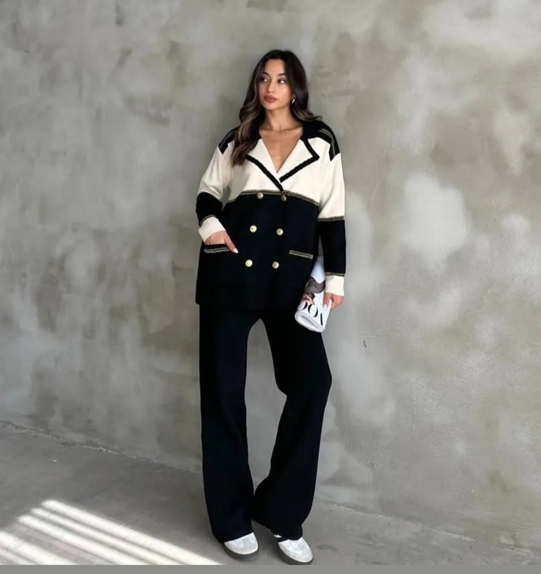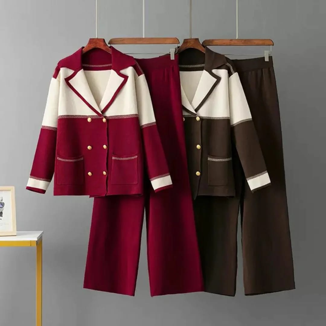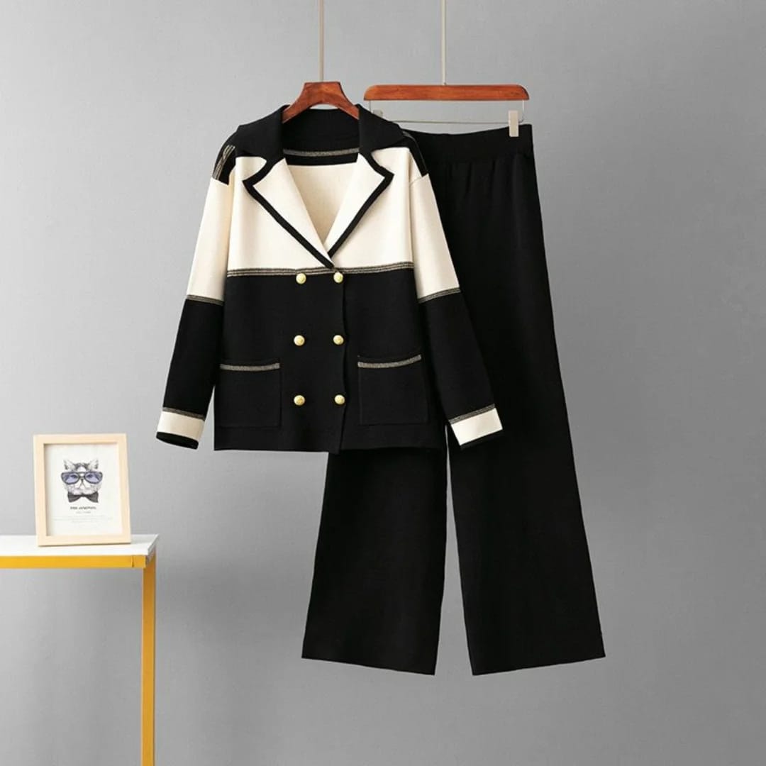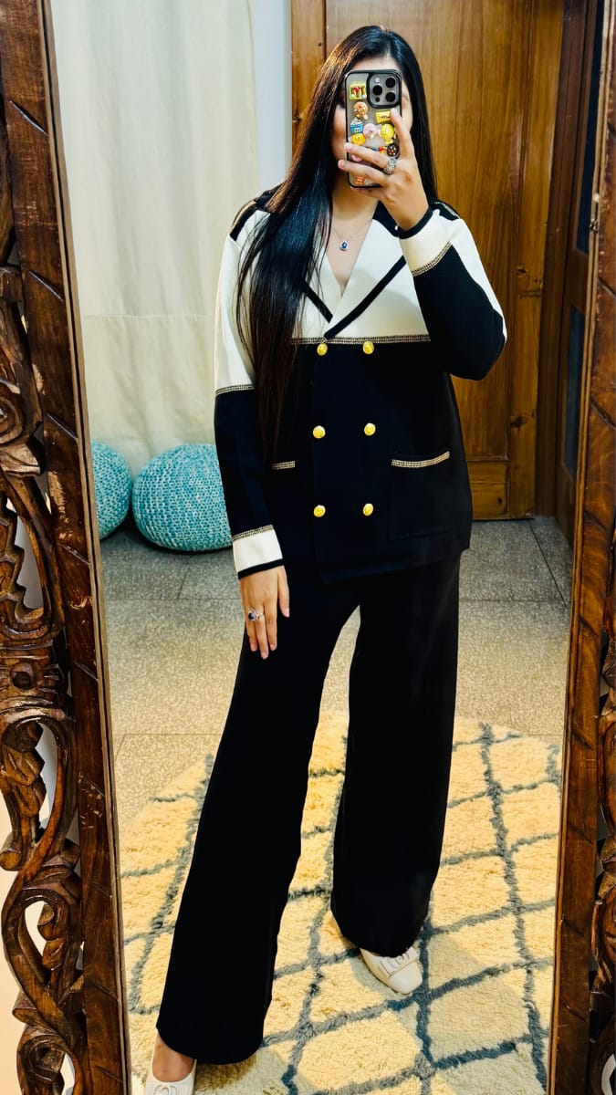 Elegant knit co-ord set featuring a double-breasted jacket with gold buttons and matching straight-fit pants Made from premium stretch knit for a chic, comfortable look. Perfect for brunches, meetings, or evenings out.