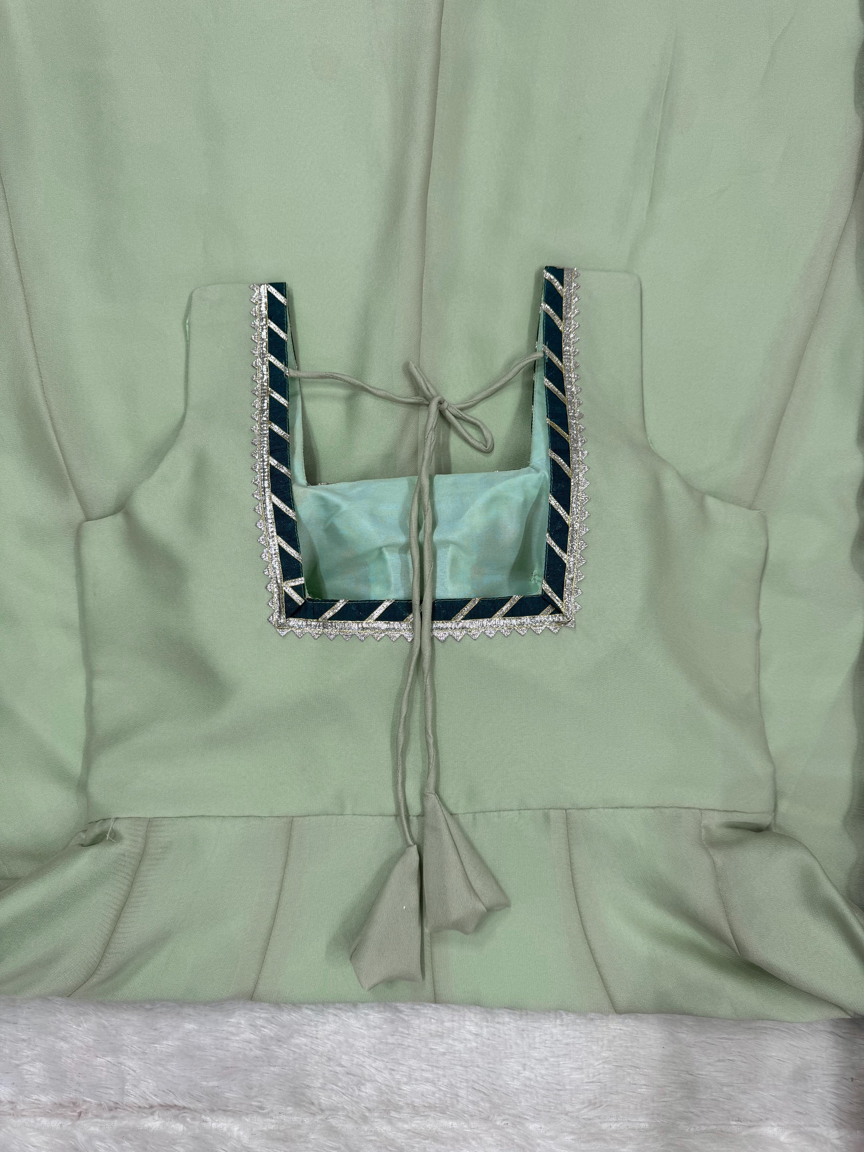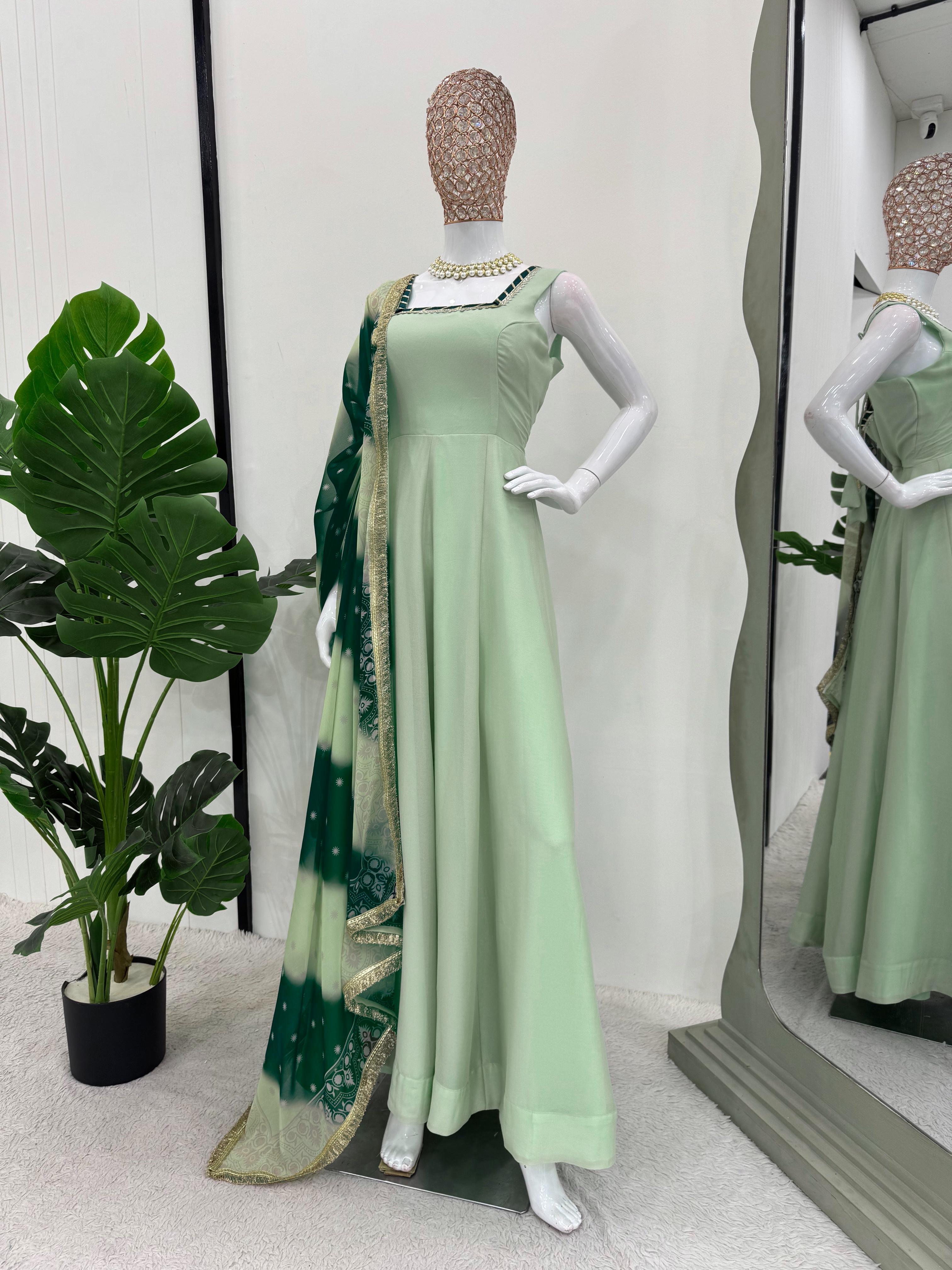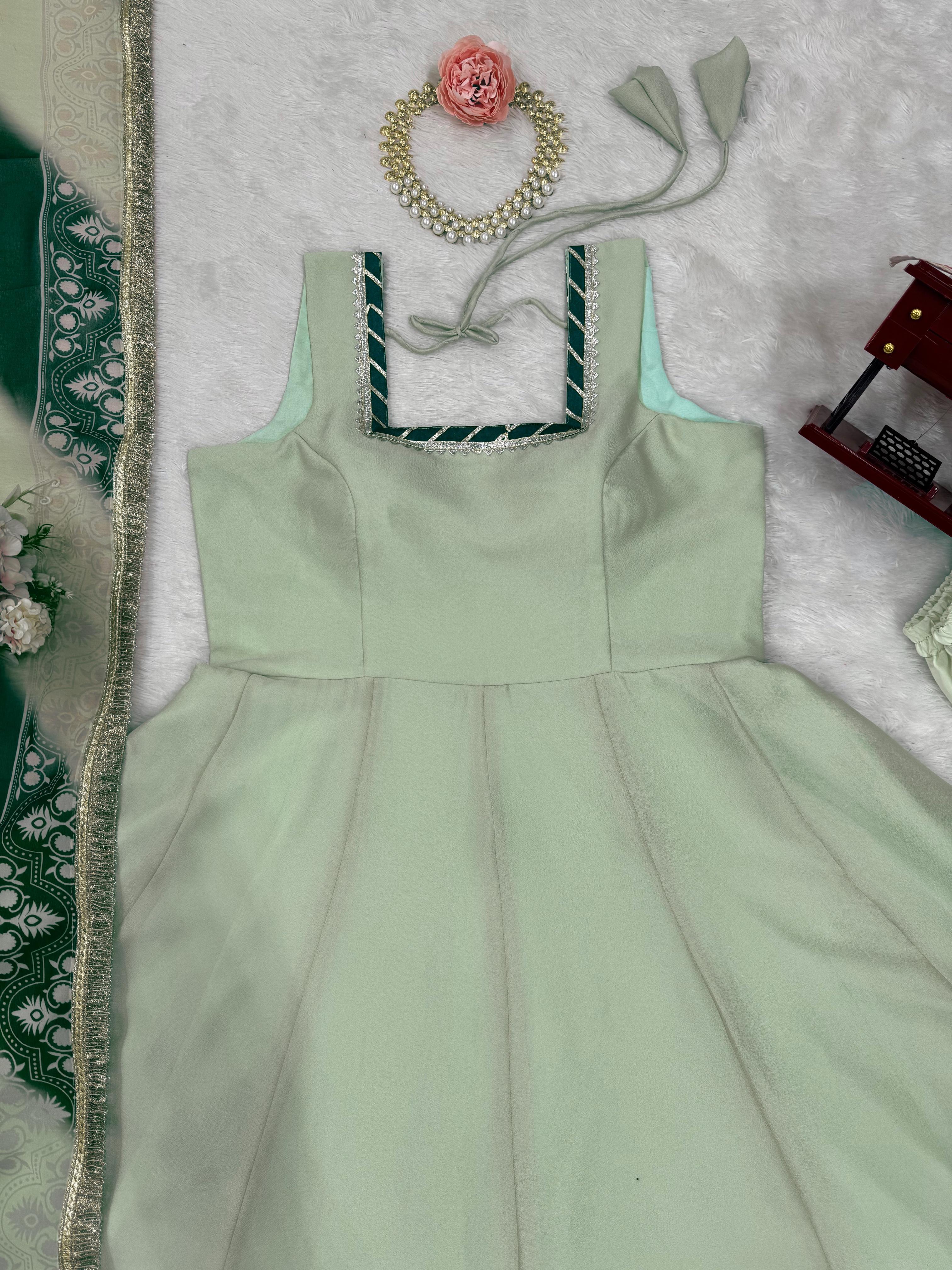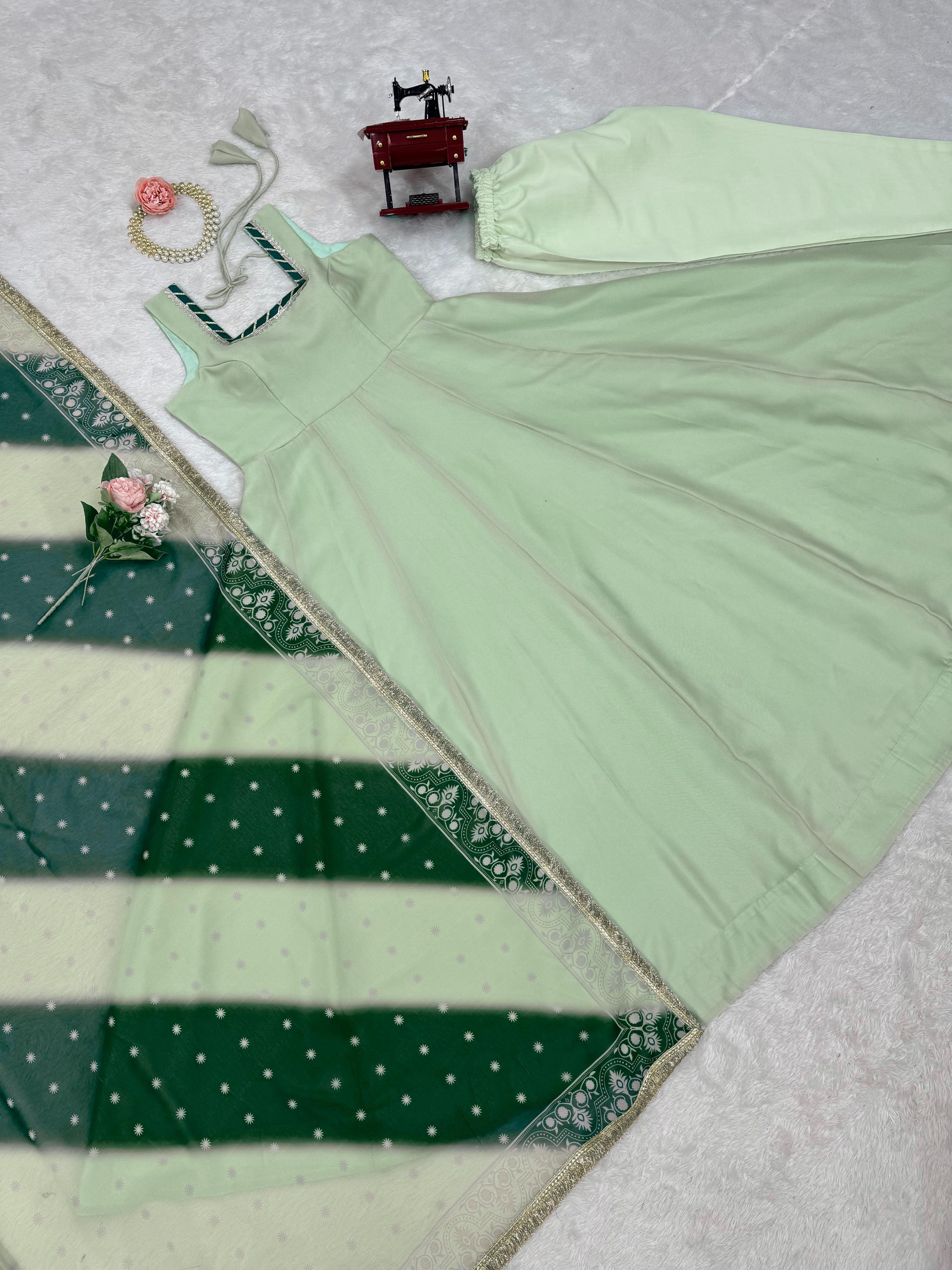 Elevate your ethnic wardrobe with this Designer Gown Set made from premium Star Georgette fabric. Featuring fancy lace work, soft inner lining, and a digitally printed dupatta, this gown blends traditional charm with modern elegance — perfect for festive wear, parties, and weddings. Available in sizes-S, M, L and XL.