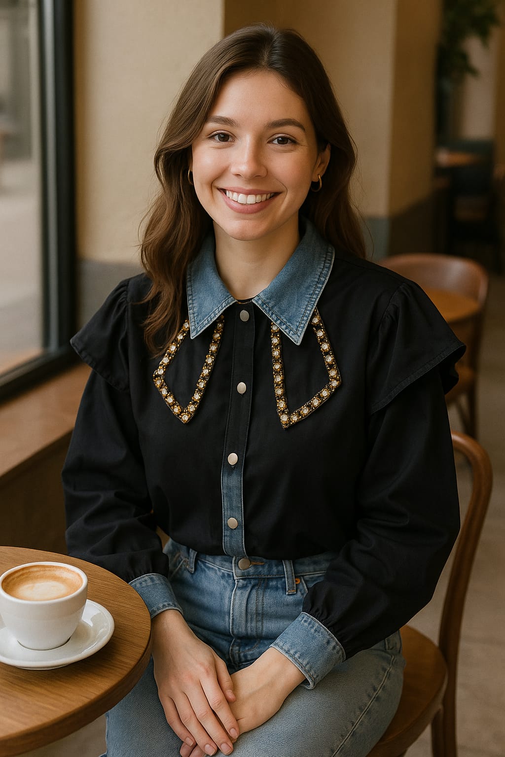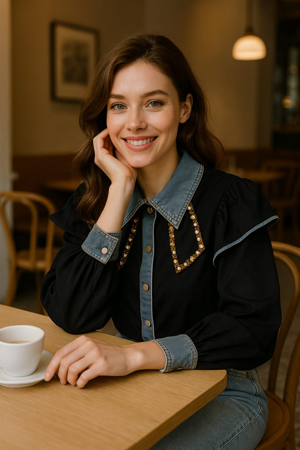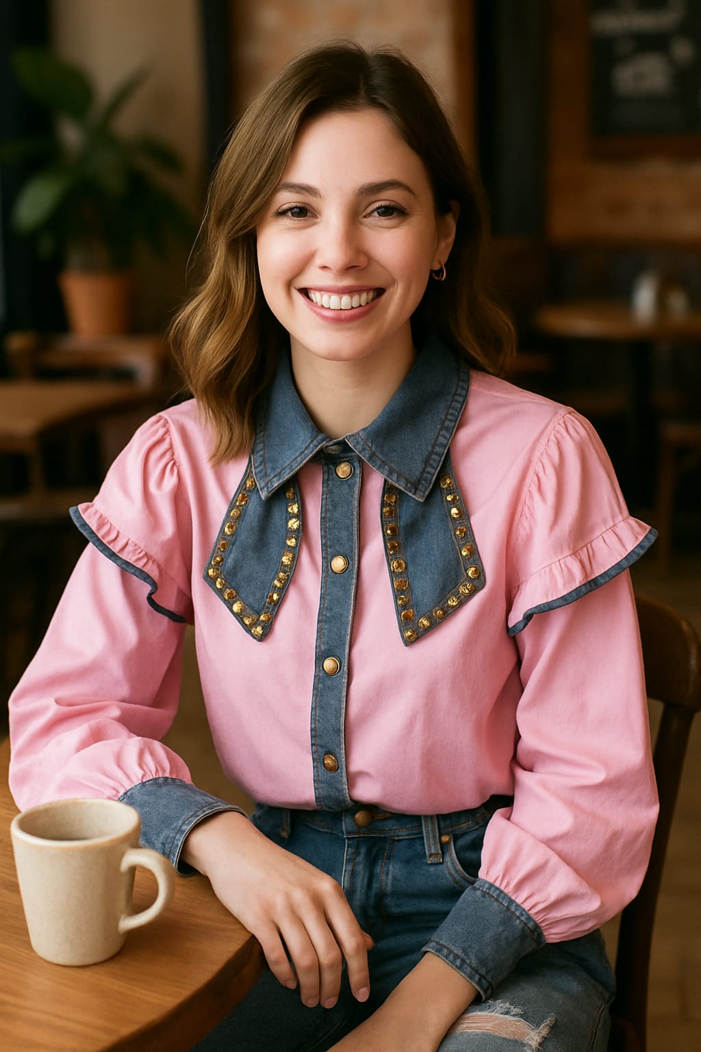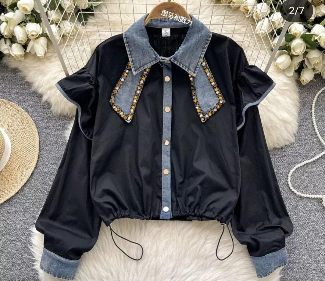 Embrace a blend of classic and contemporary with our Studded Denim Collar Cotton Ruffle Shirt. Crafted from soft, breathable cotton, this shirt features a distinctive studded denim collar and delicate ruffle detailing. Available Size-S,M,L,XL it's the perfect addition to any wardrobe.