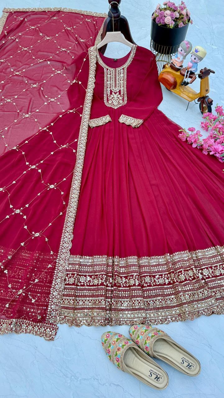 Crafted from luxurious Fox Georgette with delicate embroidery & sequins. Available in Size-S,M, L, XL, XXL. Elegant 58" gown paired with a 2.2m dupatta—perfect for festive occasions and parties!