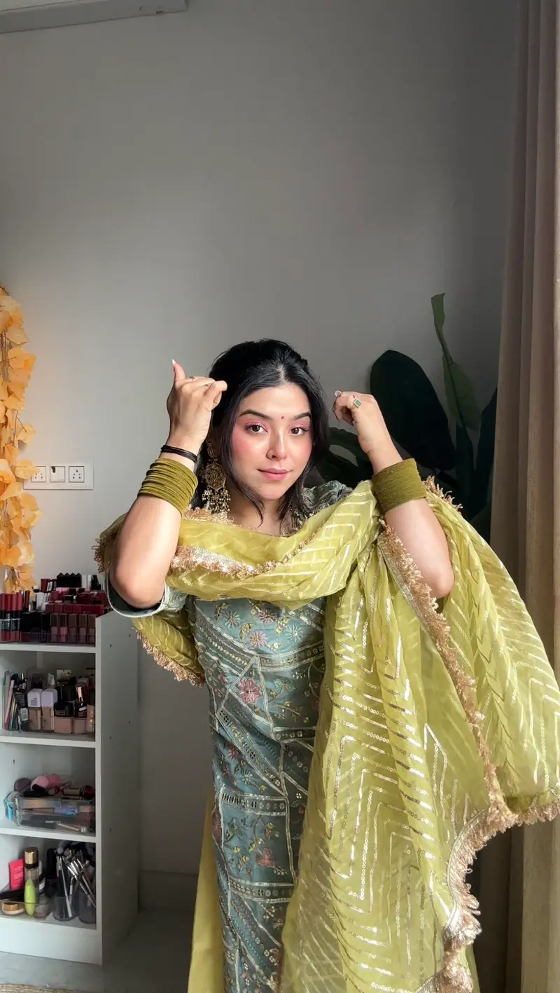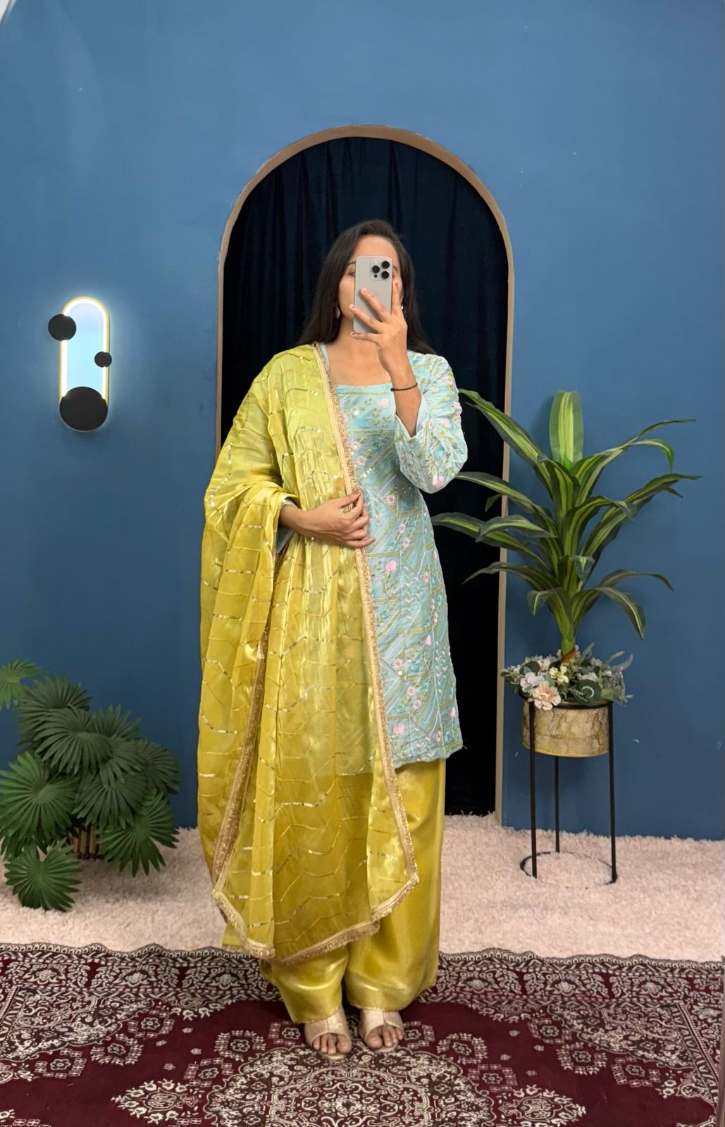 Elegant 3-Piece Kurta Set in Premium Jimmy Choo Fabric featuring heavy embroidery on kurta, stitched plazzo with lace, and embroidered dupatta. Available in sizes S, M, L XL,and XXL.
