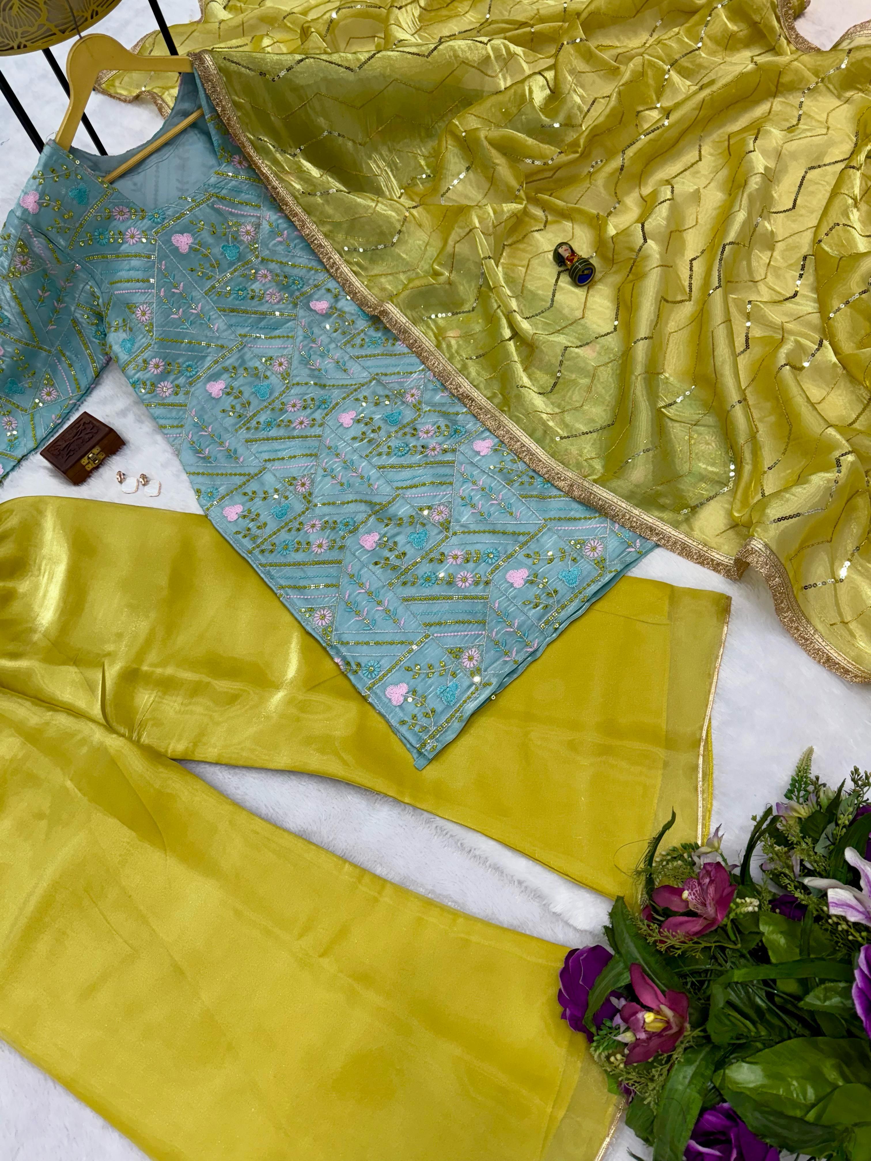 Shop this 3-piece Kurta Plazzo Set crafted from premium Jimmy Choo fabric. Featuring heavy front & back embroidery on the kurta, fully stitched plazzo with lace detailing, and an embroidered dupatta. Available in Size-S ,M L , XL and XXL. Perfect for festive and casual wear.