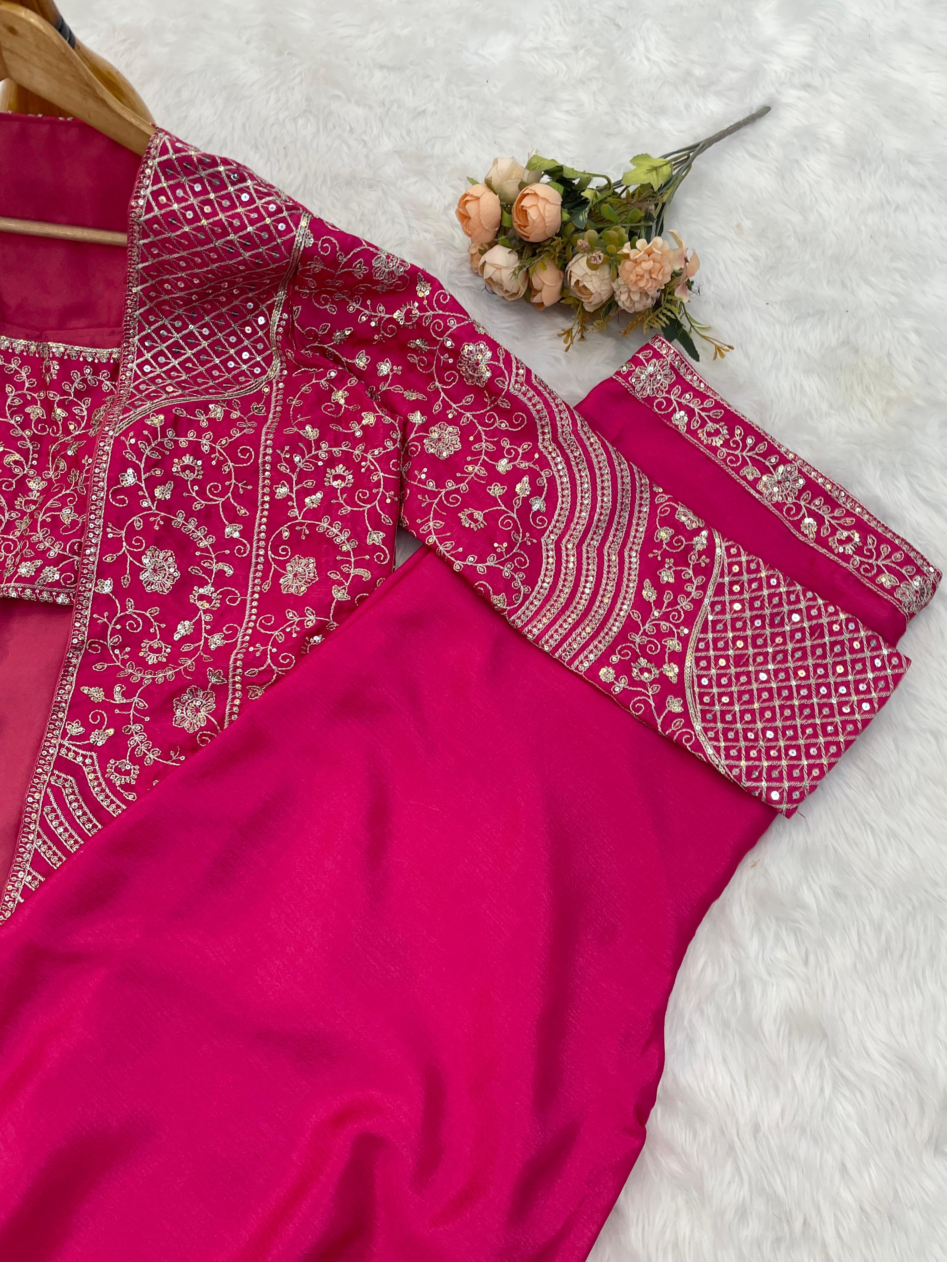 Elevate your ethnic style with this Rani Pink Koti Set crafted from premium Chinon silk. Featuring intricate multicolor embroidery and sequin work, this ready-to-wear set offers a vibrant and elegant look for festivals, weddings, and special occasions. Available in Size-S , M L and XL, designed for comfort and style.