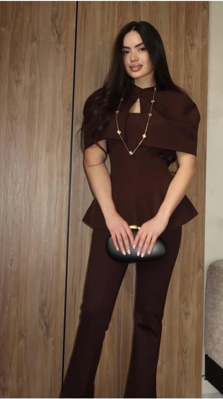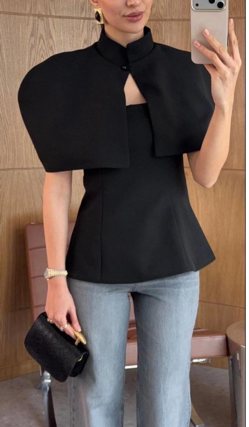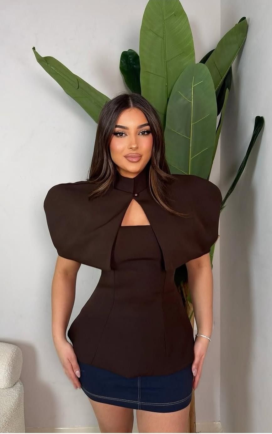Royal Cape Top—a statement piece with a graceful cape silhouette that flows effortlessly. Crafted in rich brown, black, and white tones, it offers a flattering fit for chic, elegant looks. Perfect for day-to-night styling.
