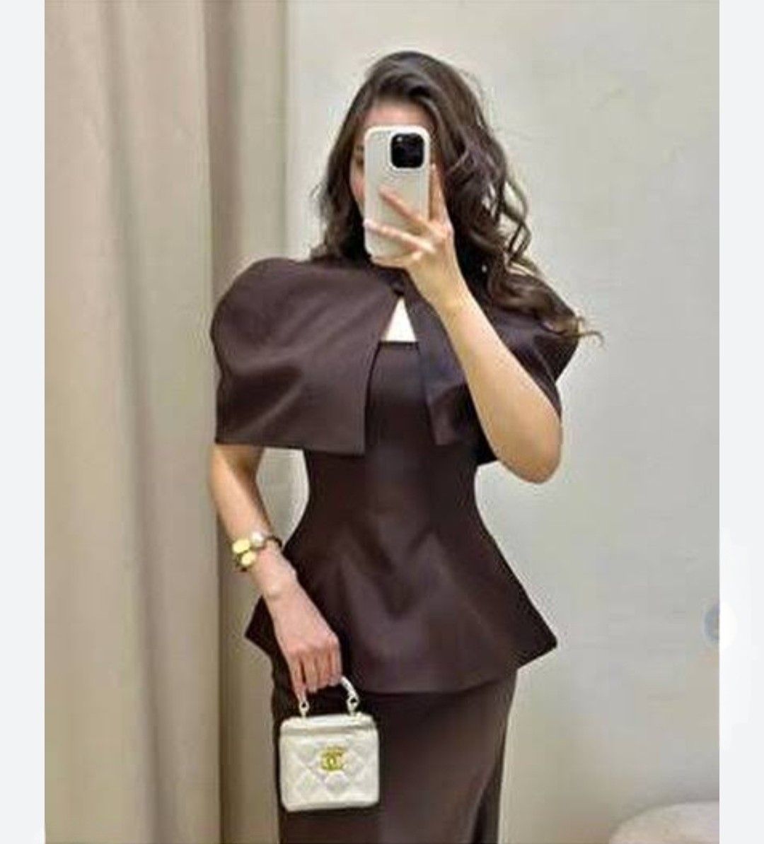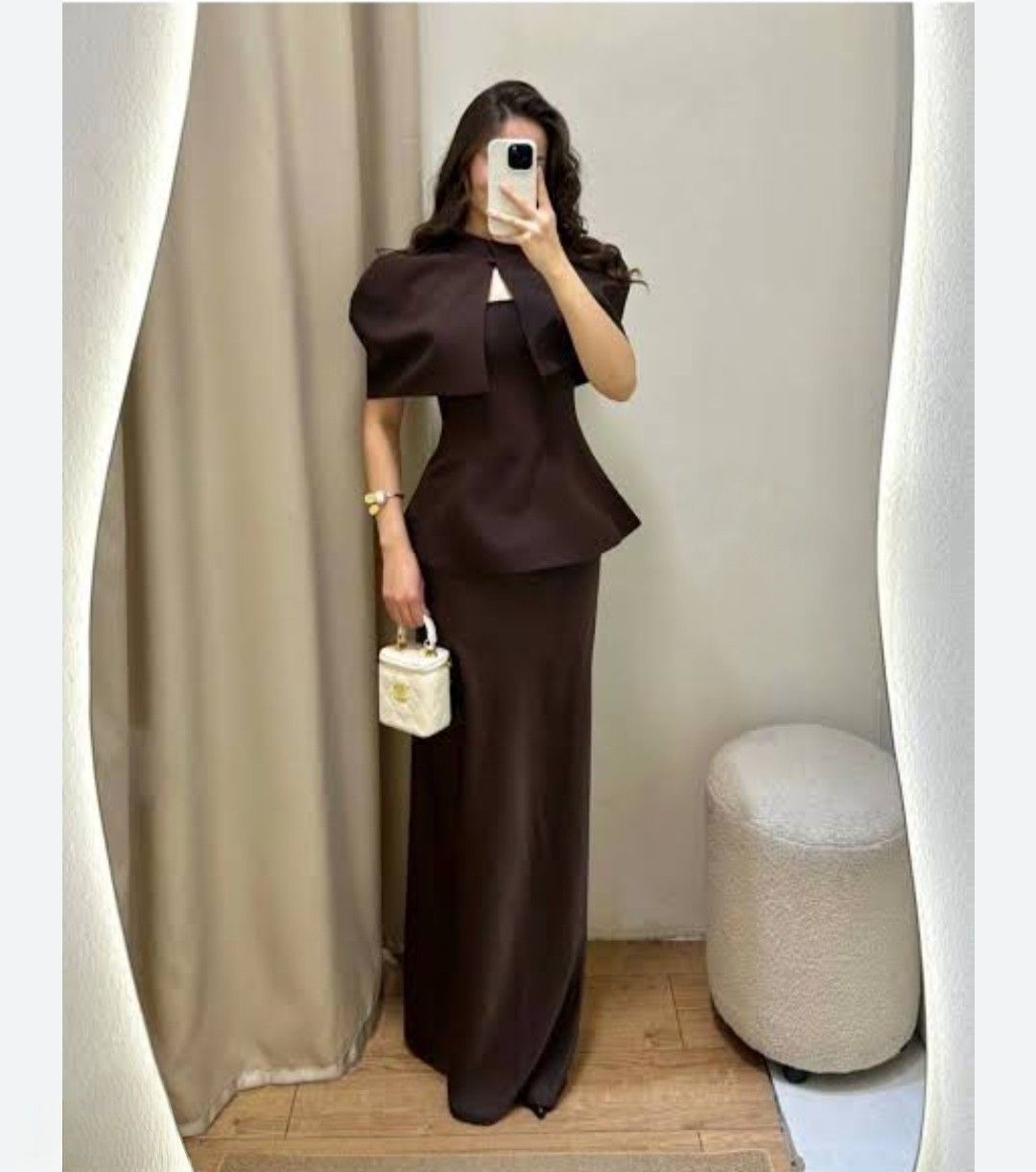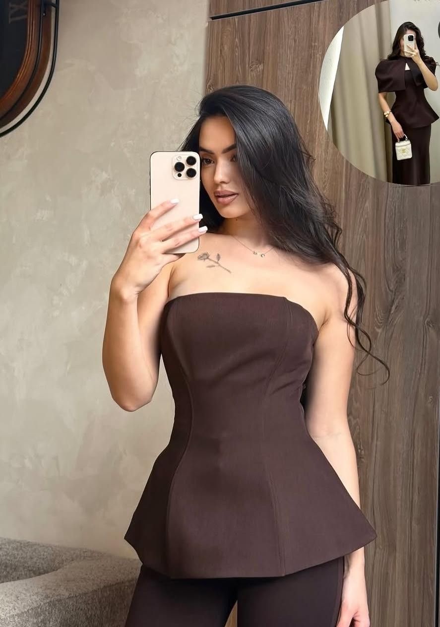 Royal Cape Top—a statement piece with a graceful cape silhouette that flows effortlessly. Crafted in rich brown, black, and white tones, it offers a flattering fit for chic, elegant looks. Perfect for day-to-night styling.