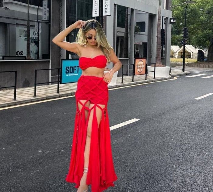 A sleek bandeau top paired with a statement knotted fringe skirt designed to accentuate your curves and add playful movement. Perfect for vacations, beach parties, and glam evenings.