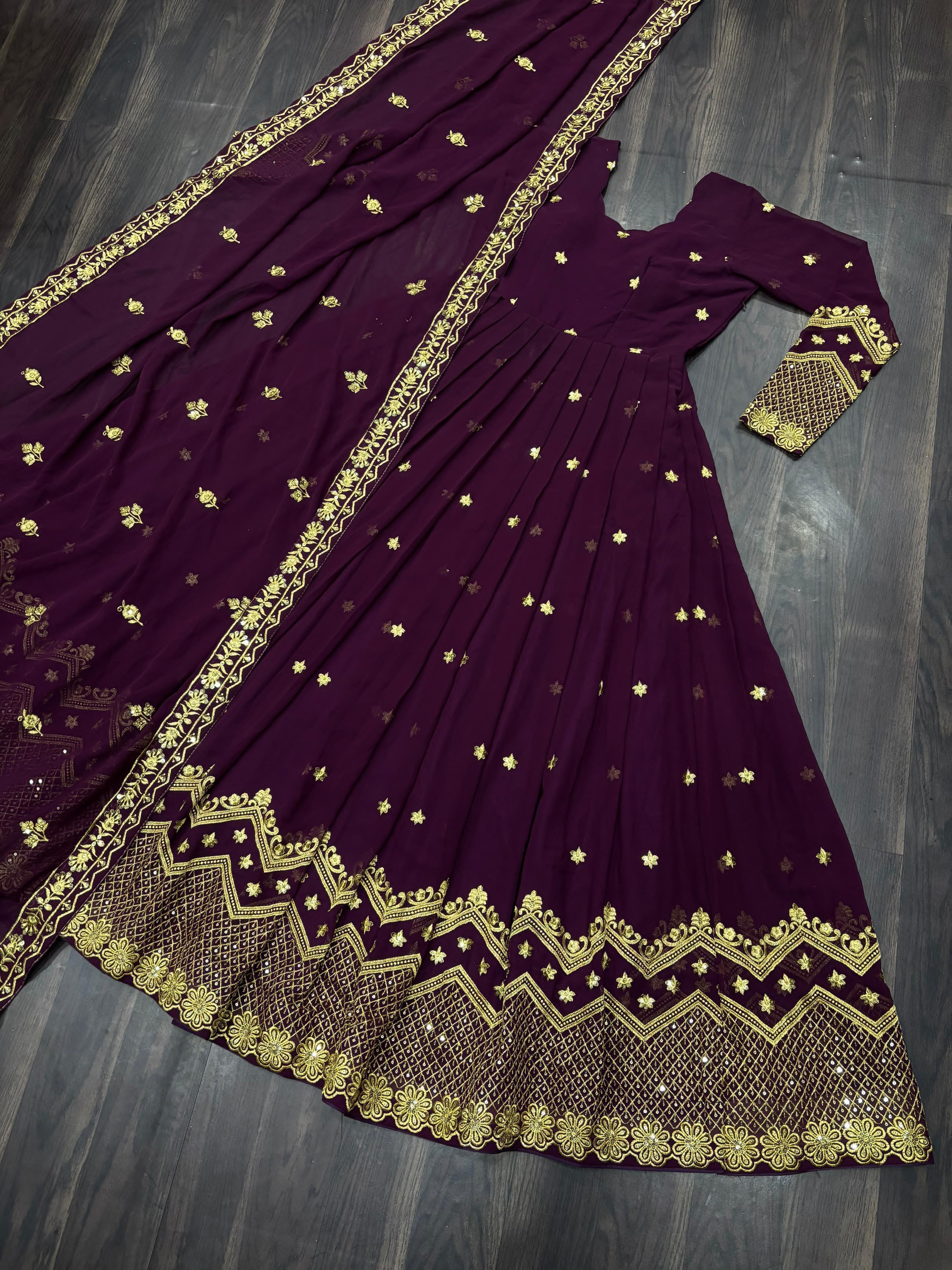 Shop this premium Faux Blooming Georgette Designer Gown featuring intricate Zari & Sequins Embroidery. Designed with a fancy neck and full sleeves, fully lined with cotton for comfort. Comes with a matching Faux Blooming Georgette dupatta with elegant embroidery. Available in Size-S ,M, L XL to XXL. Perfect for weddings, festivals, and special occasions.