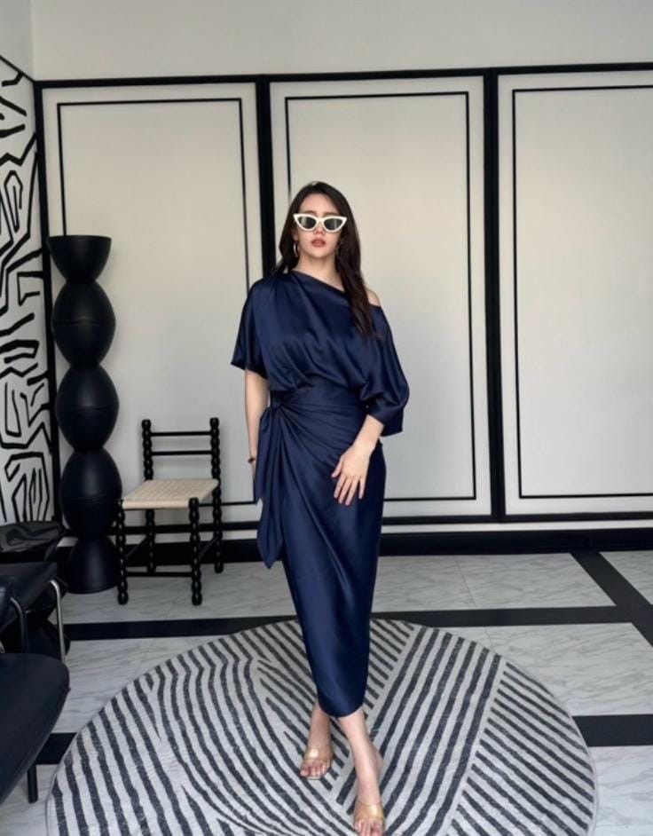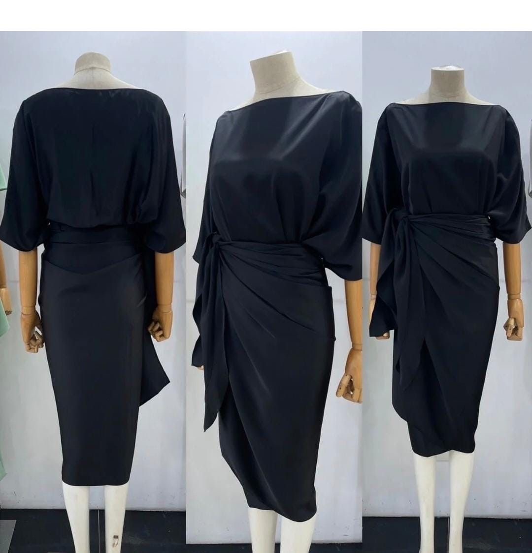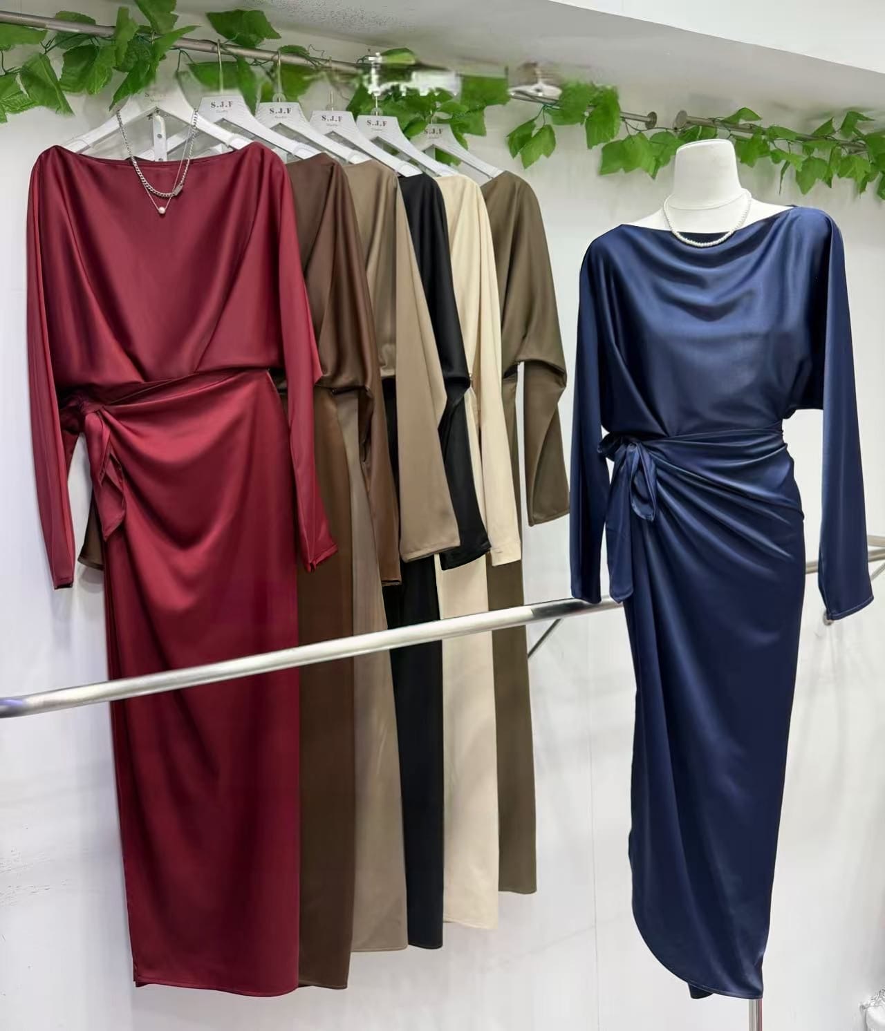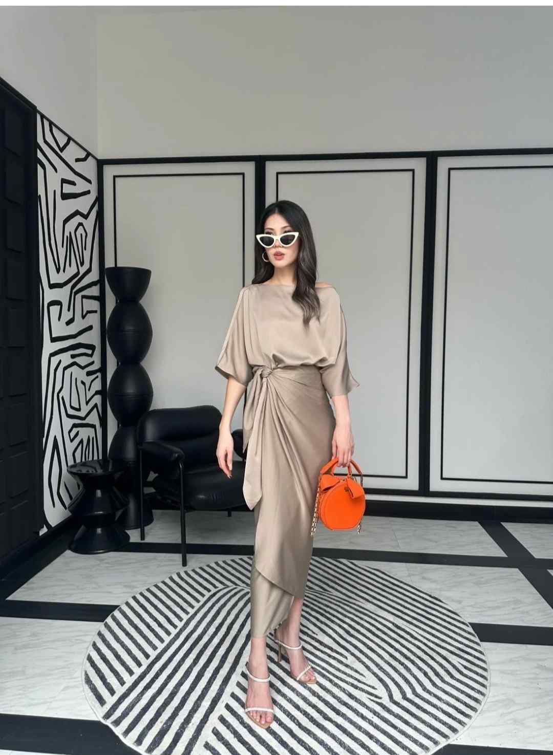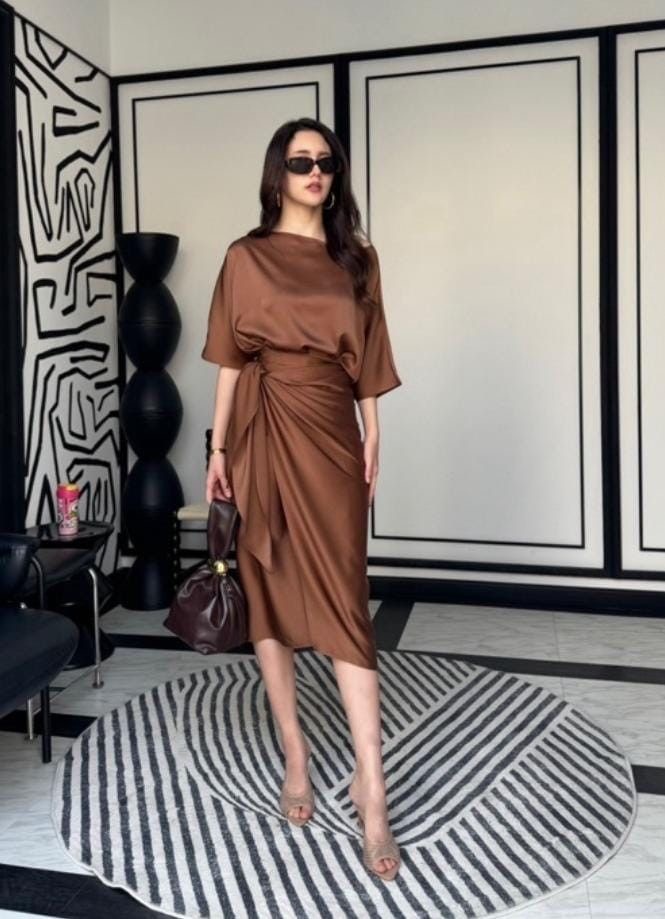 A luxe satin dress designed with a flattering wrap silhouette that enhances your waist and drapes gracefully over the body. The soft sheen finish adds timeless elegance, making it perfect for dinners, date nights, and special occasions.