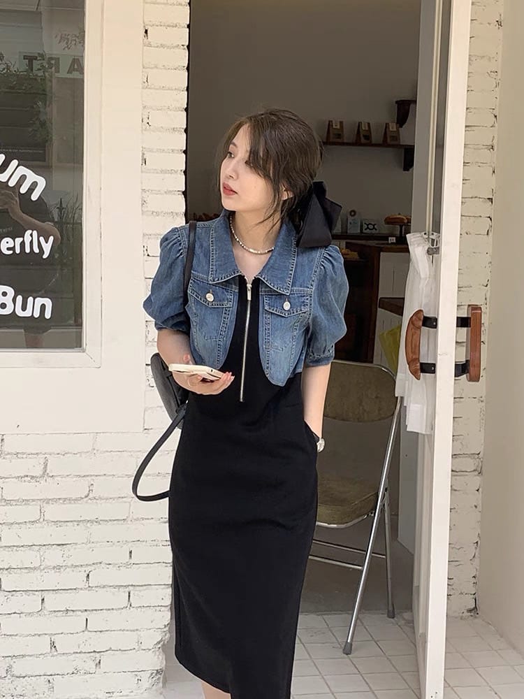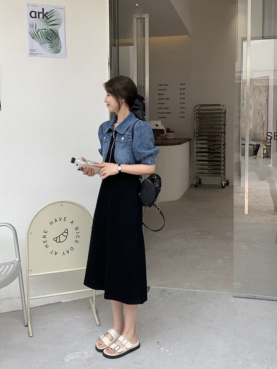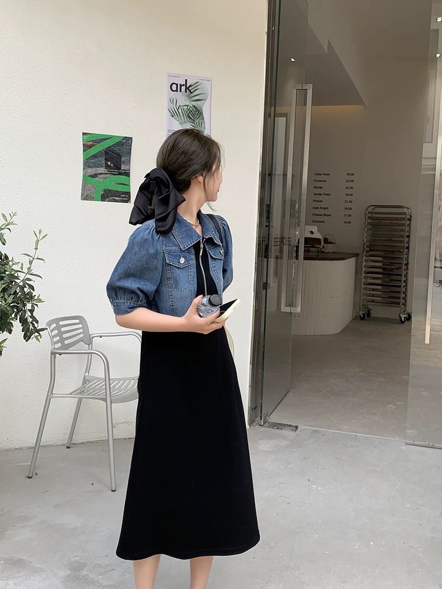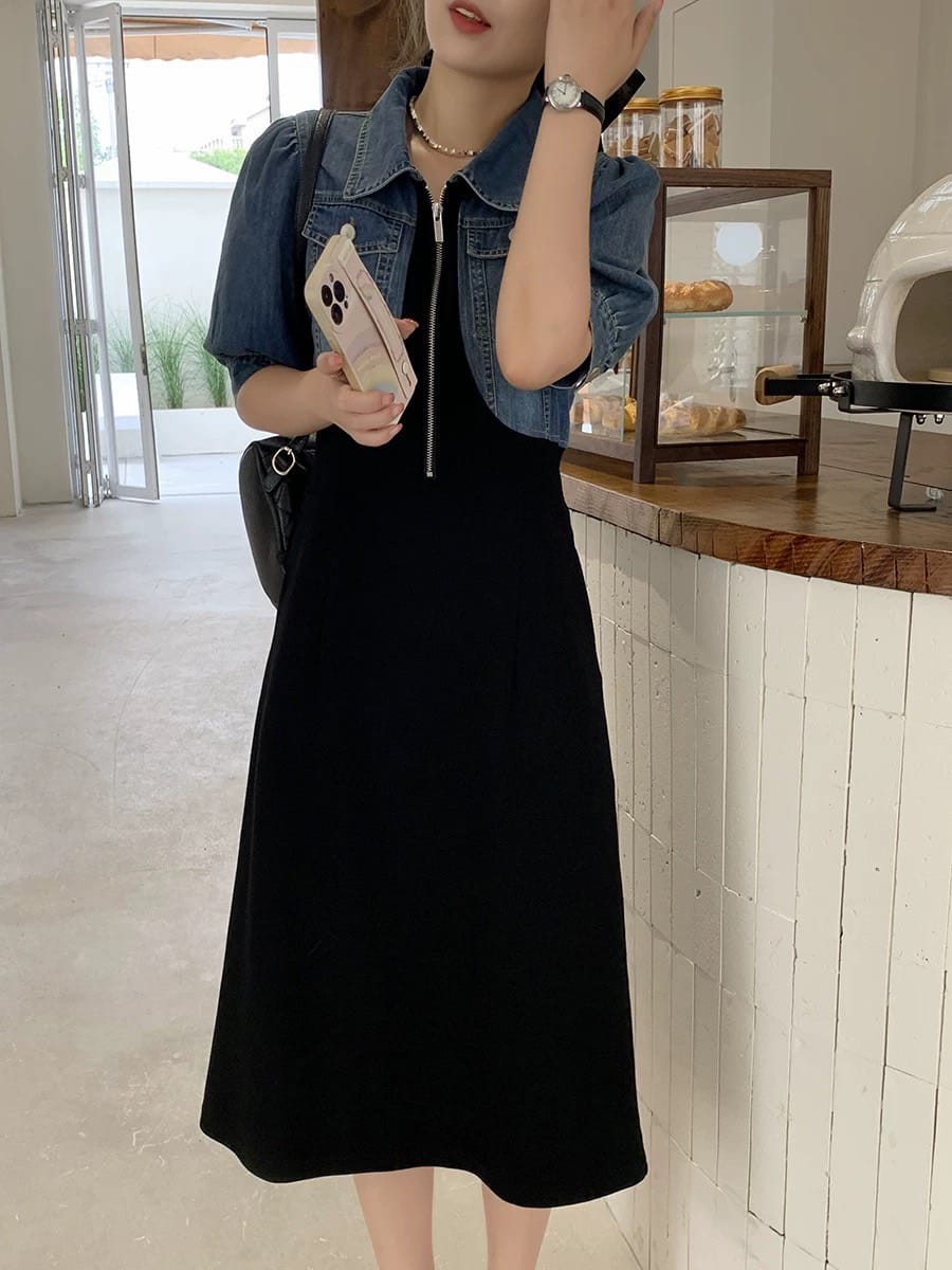 This soft washed denim long dress features a front zipper, side pockets, and delicate detailing. Designed for a perfect freesize fit, it’s ideal for casual or semi-formal occasions.
