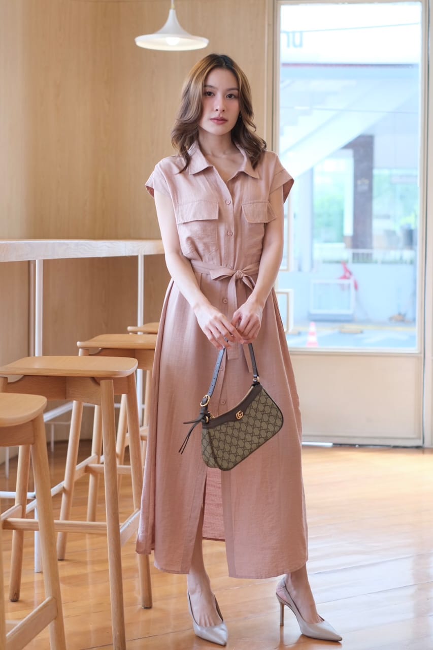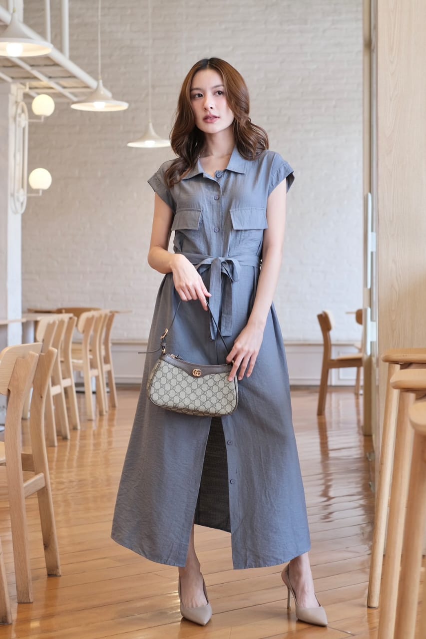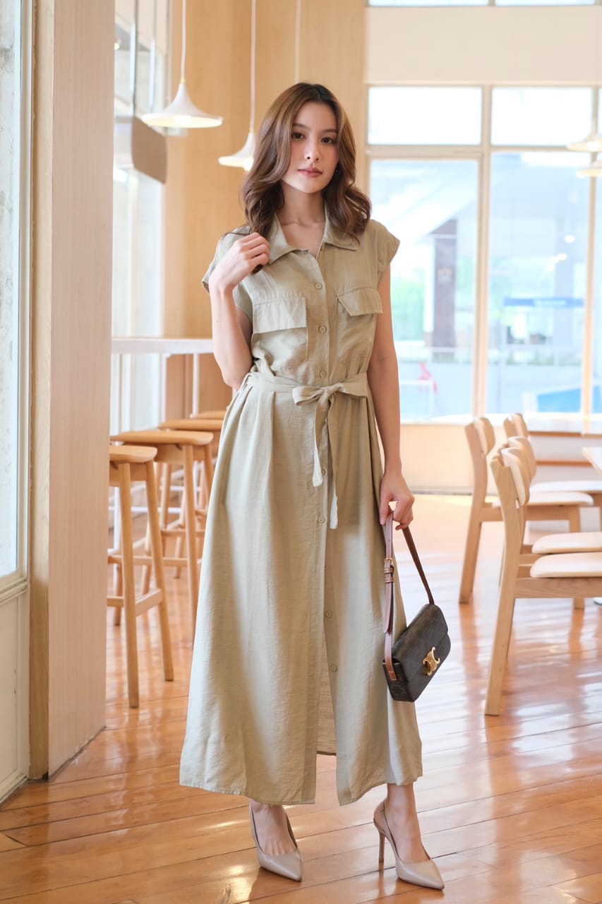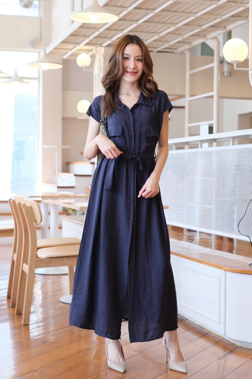 Embrace timeless elegance with this breathable linen-cotton blend dress. Featuring a collared neckline, full-length buttons, functional chest pockets, and a waist tie bow, it offers both style and comfort.